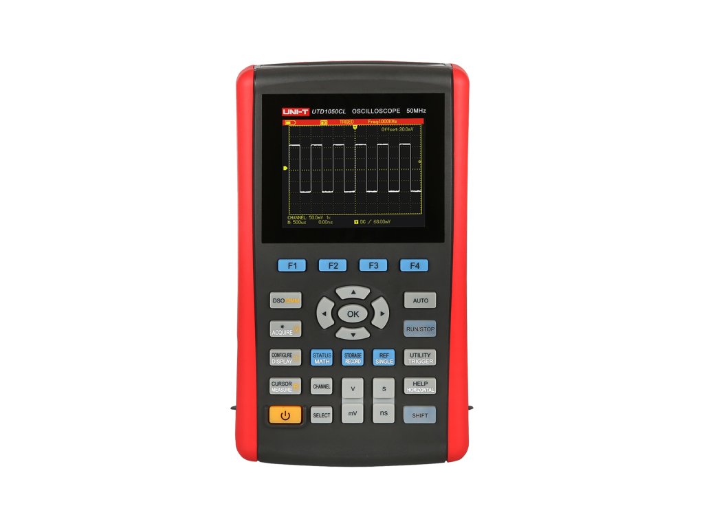 UTD1050CL je digitalni prijenosni osciloskop i multimetar u jednom, s opsegom frekvencije od 50MHz. Prednost uređaja je LCD zaslon u boji s visokim kontrastom. Zaslon s 3999 podjela omogućuje bilježenje mjerenja širokog raspona napona - do 200 V/bar, kao i struje, otpora, dioda, kapaciteta i testa kontinuiteta kruga. Funkcionalnost uređaja proširuje jedinstvena funkcija bilježenja i spremanja i dohvaćanja signala. USB priključak omogućuje brzo bilježenje ili prijenos signala i snimanje na povezanom računalu. Ugrađena punjiva baterija osigurava 8 sati neprekidnog rada, koji se može nastaviti nakon spajanja uređaja na izvor napajanja.