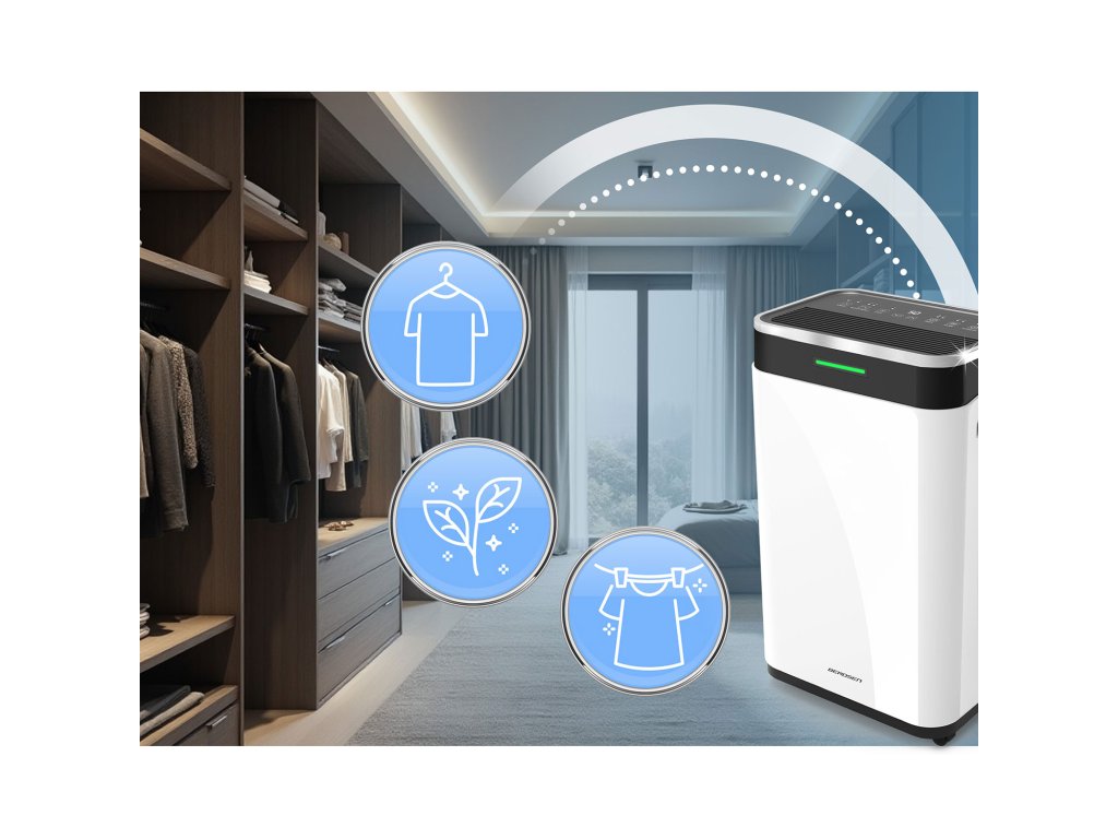 - Skraćuje vrijeme sušenja odjeće – odvlaživač intenzivno odvlažuje zrak, ubrzavajući prirodni proces isparavanja vlage iz rublja.