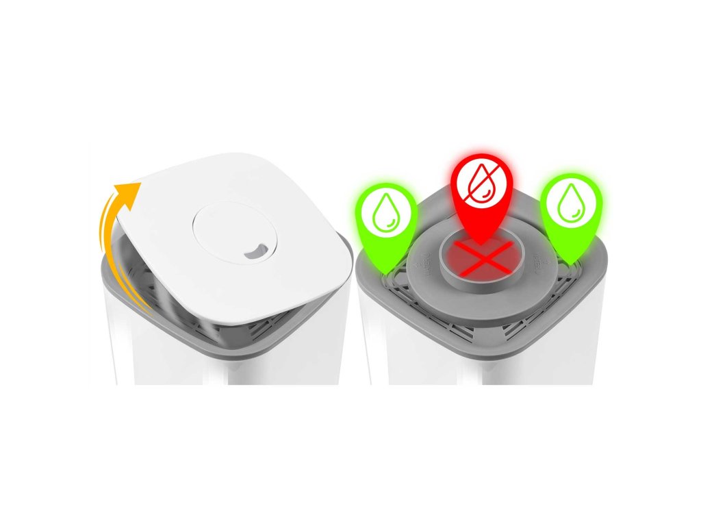 - Jednim pritiskom na gumb uvodimo ovlaživač u stanje mirovanja što isključuje zaslon i diskretno nastavlja ovlaživanje.