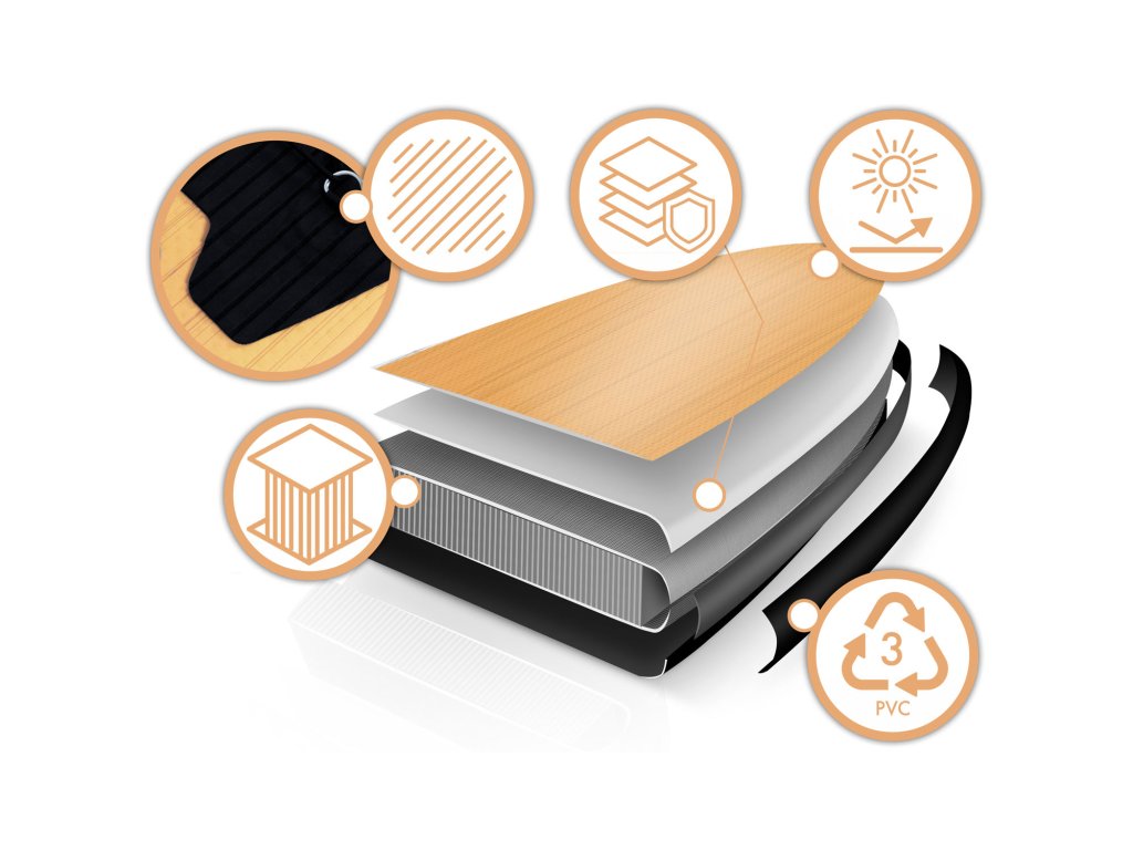 Prémiová SUP doska s trojvrstvovou PVC konštrukciou, vstavanou koľajnicou z uhlíkových vlákien a zosilnenými švami.