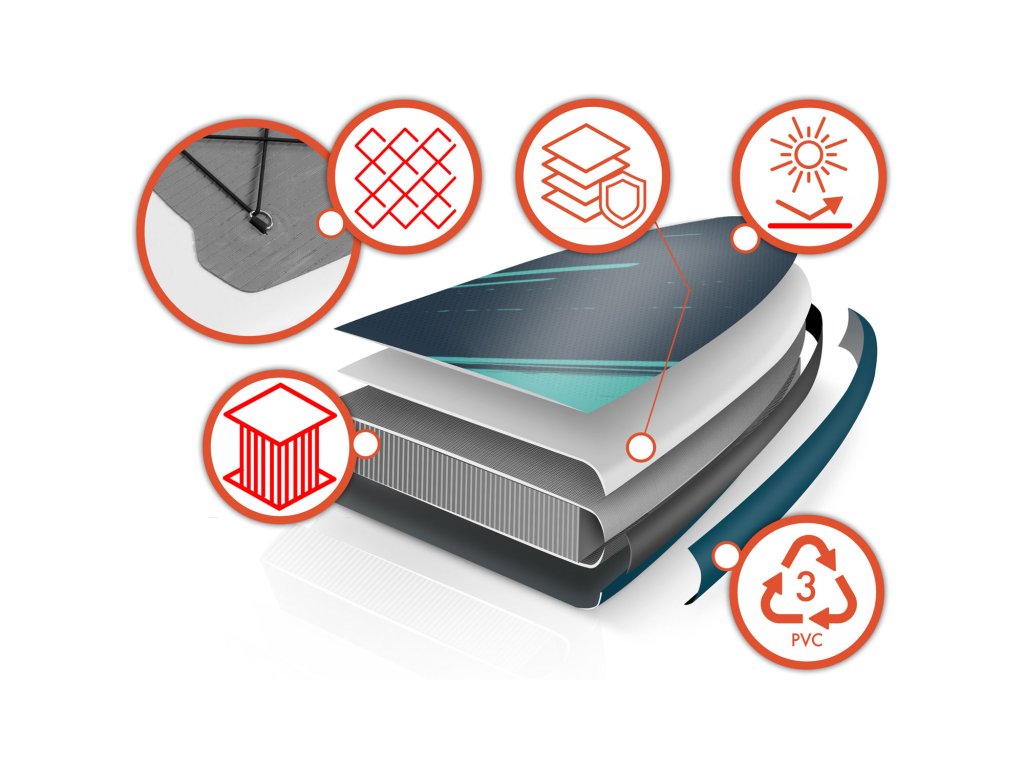 Prémiová SUP doska s trojvrstvovou PVC konštrukciou, vstavanou koľajnicou z uhlíkových vlákien a zosilnenými švami.