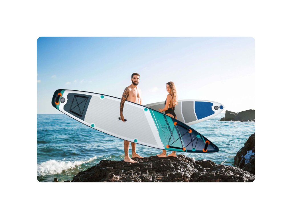 SUP paddleboard premium klase s troslojnom konstrukcijom PVC-a, ugrađenom karbonskom letvicom i ojačanim šavovima.