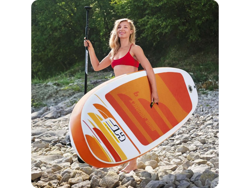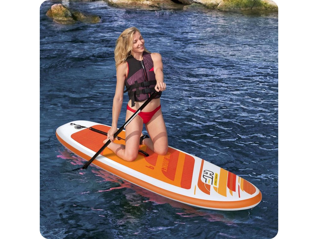 Surfna daska Bestway izrađena je od materijala Drop Stitch koji osigurava izvanrednu izdržljivost, stabilnost i trajnost. U pakiranju dobivate uže za surfanje, čvrsto veslo, ručnu pumpu i set za popravak. Maksimalno opterećenje surfne daske Bestway je do 100 kg. To je neophodan element ljetne prtljage svakog ljubitelja dugih izleta po vodenim površinama. Ako preferirate aktivni odmor umjesto ležanja na plaži, ovaj proizvod je upravo za vas!