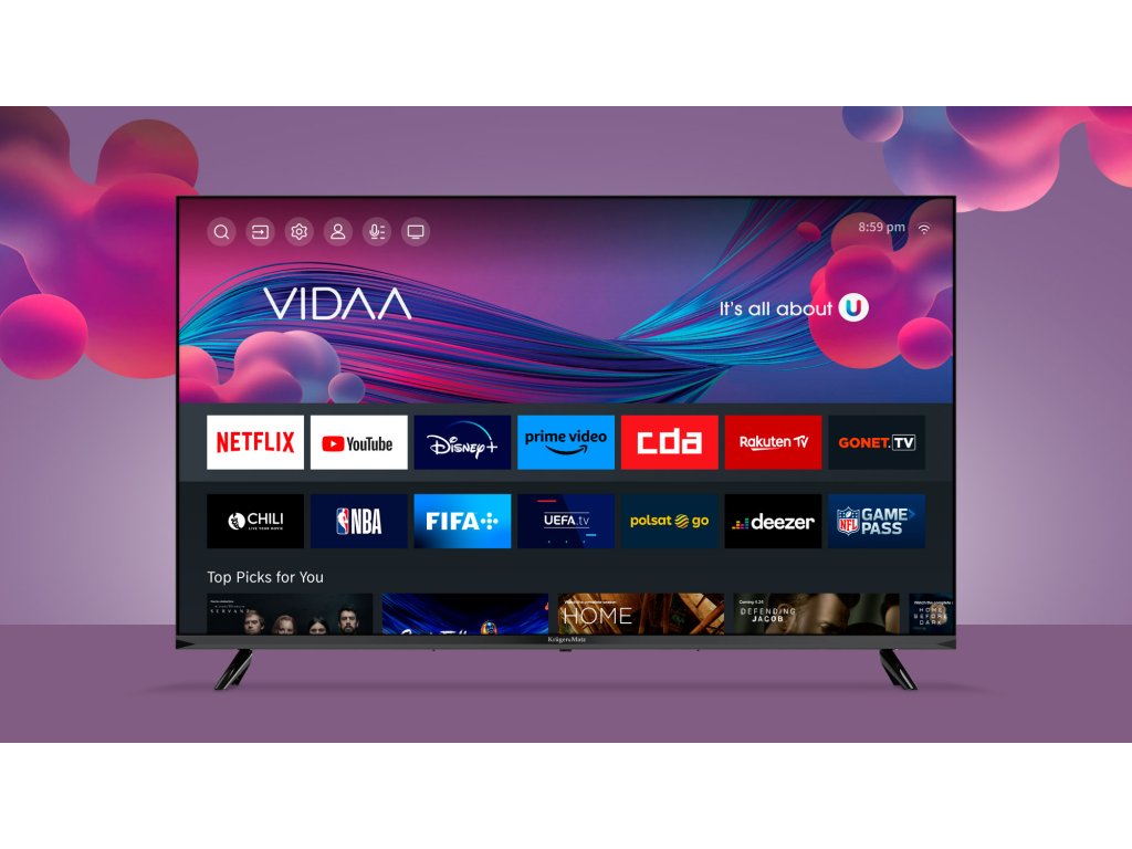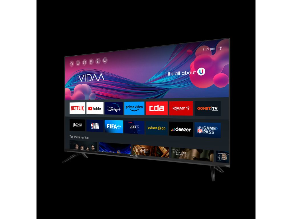 Smart TV Kruger&Matz KM0243FHD-V zahvaljujući sustavu VIDAA nudi pristup najboljem glazbenom, filmskom i sportskom sadržaju, uključujući omiljene platforme kao što su: Netflix, YouTube, Disney Plus ili Amazon Prime Video.Uživajte u omiljenim filmovima i serijama u visokoj kvaliteti kad god poželite.