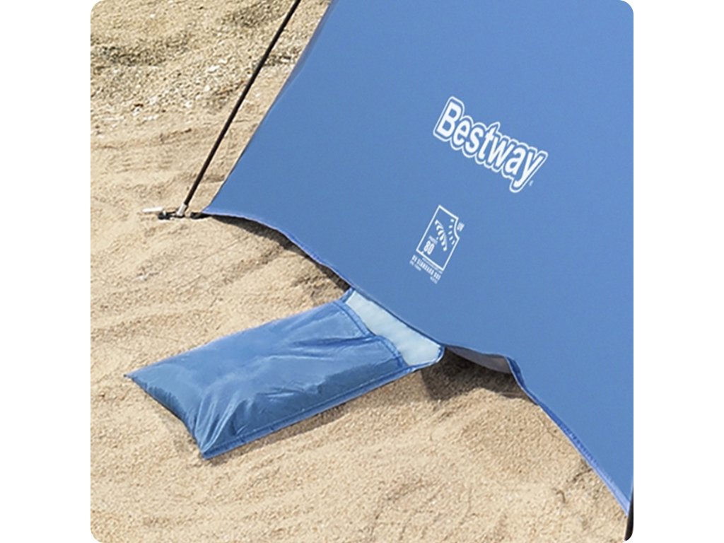 Turistički šator marke Bestway izrađen je od izdržljivog poliestera, dodatno prekrivenog filtrom UV 80+, koji pruža zaštitu od vjetra, vode i sunčevih zraka.