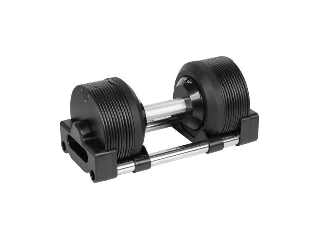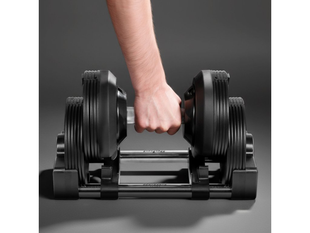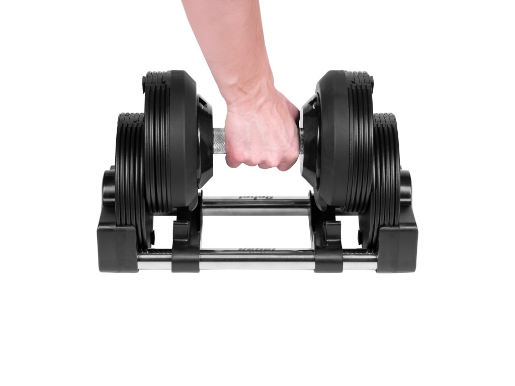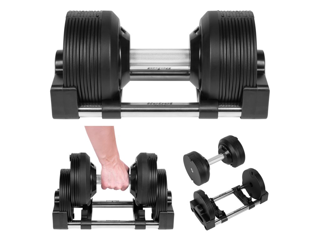 Podesiva utega 24 kg Rebel Active moderno je rješenje za osobe koje žele učinkovito trenirati bez zauzimanja puno prostora. Zamjenjuje set klasičnih utega, pružajući uštedu prostora i brz pristup različitim razinama opterećenja. Idealna za kućne teretane, omogućuje sveobuhvatan trening cijelog tijela – od bicepsa, tricepsa, do ramena i leđa.