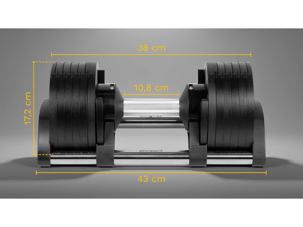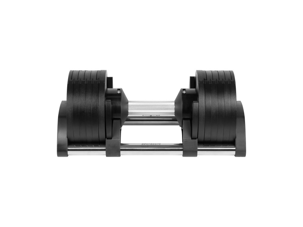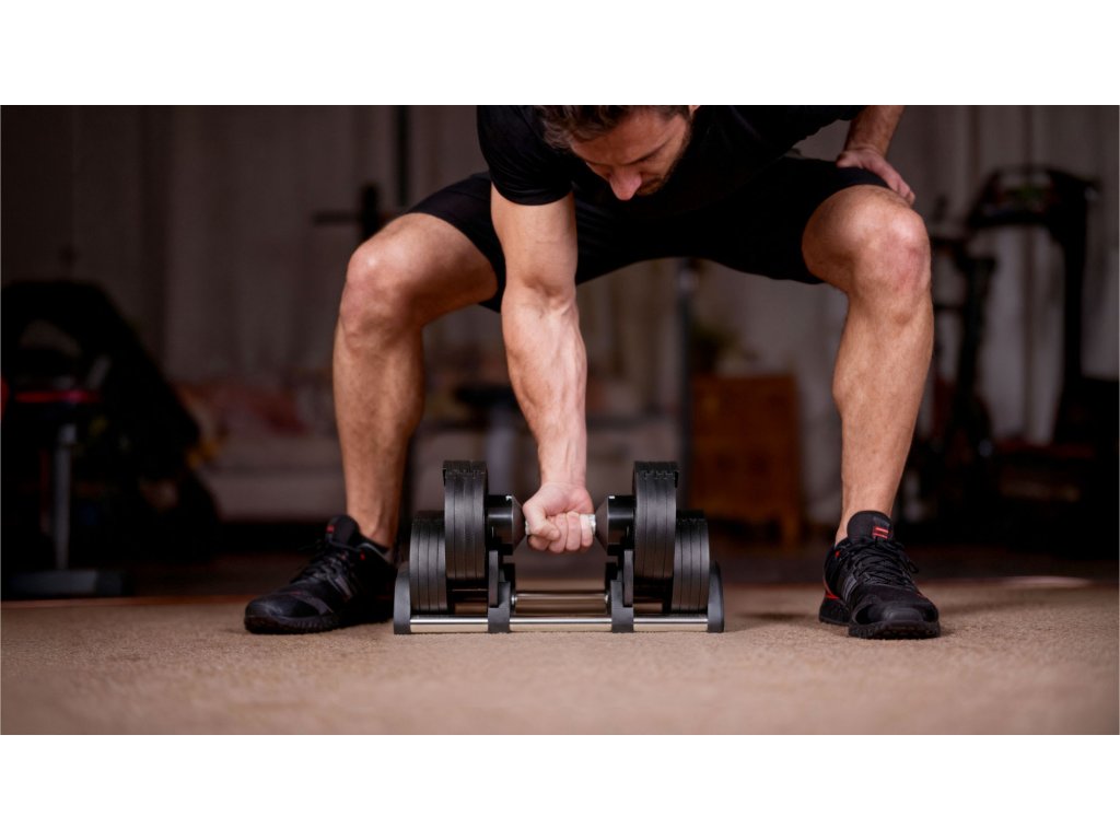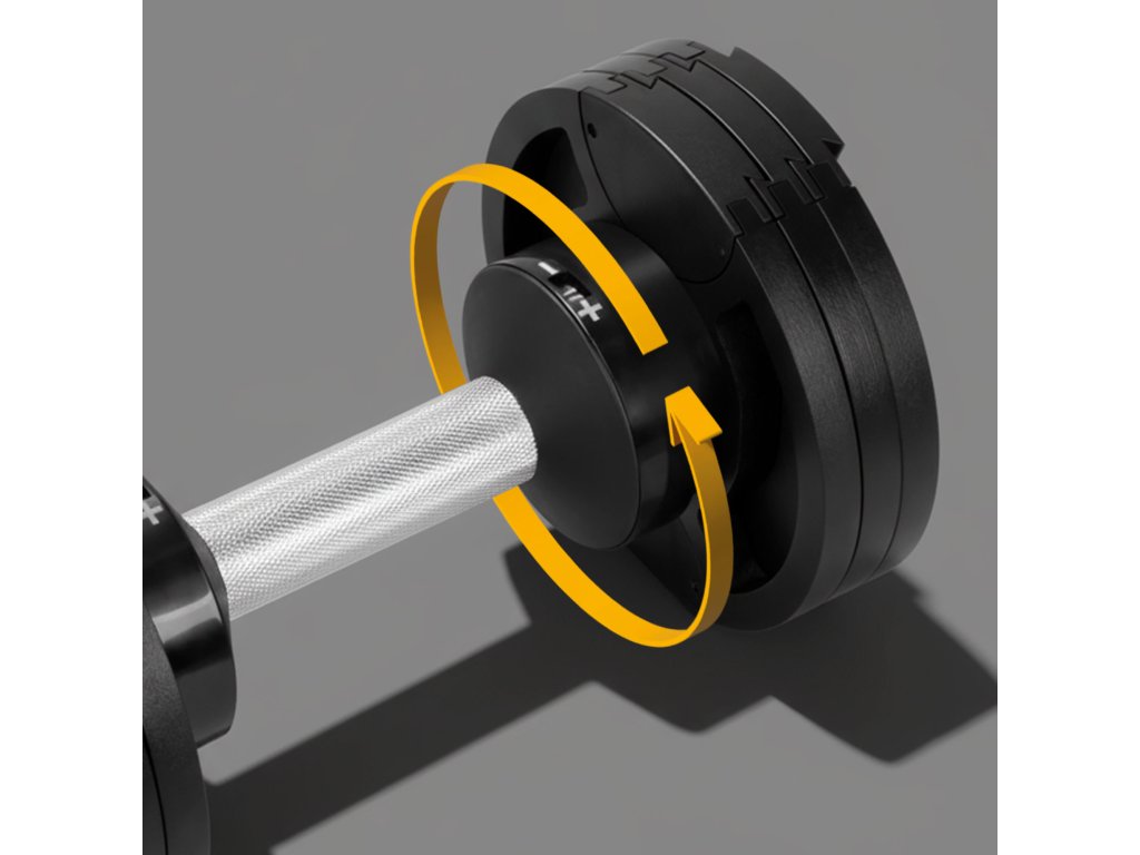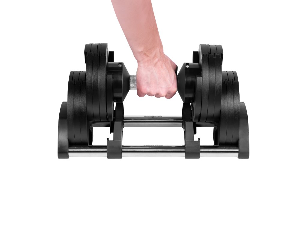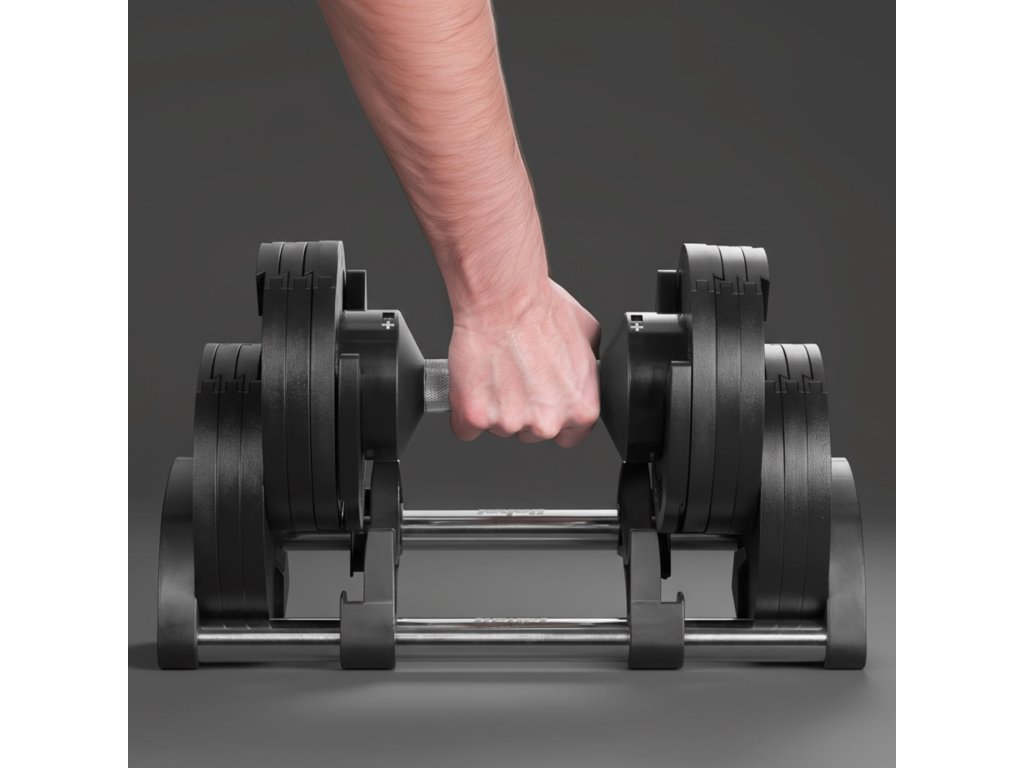 Sustav automatskog podešavanja omogućuje brzu promjenu težine u 12 konfiguracija – od 2 do 24 kg – jednostavnim okretanjem ručke. Zahvaljujući tome, podesivi utezi Rebel Active zamjenjuju cijeli set klasičnih utega, štedeći prostor u domu i vrijeme treninga. Precizni mehanizam blokira odabranu težinu, osiguravajući glatkoću i sigurnost svake sesije vježbanja.