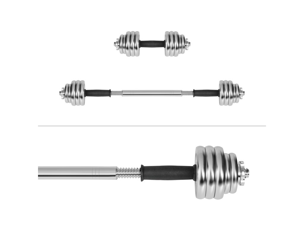 Set je izrađen od visokokvalitetnog lijeva, prekriven izdržljivim kromiranim premazom koji štiti od korozije, ogrebotina i mehaničkih oštećenja. Krom daje utezima elegantan izgled i povećava njihovu dugovječnost čak i pri intenzivnom korištenju.
