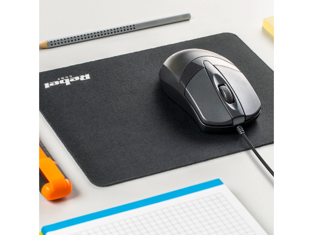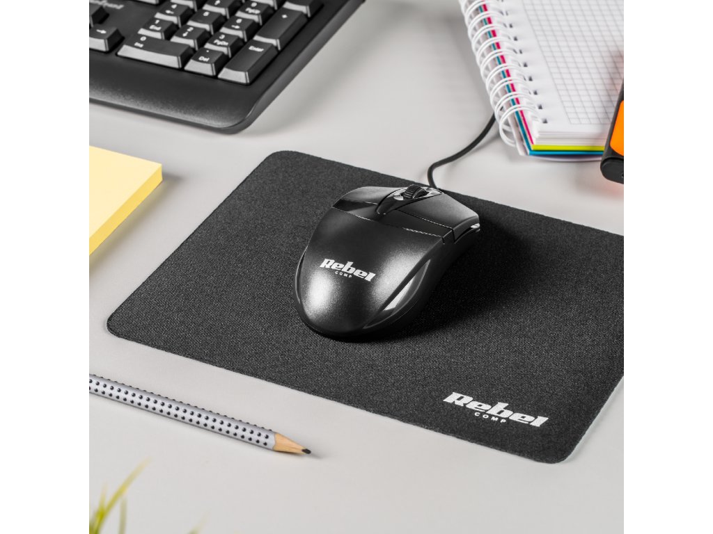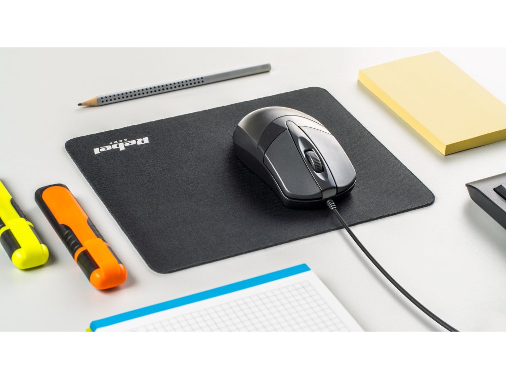Podloga za miš Rebel obložena je čvrstom crnom tkaninom i kompatibilna je sa svim vrstama računalnih miševa. Osim toga, donja strana podloge za miš prekrivena je gumom protiv klizanja koja jamči da se dodatak tijekom uporabe neće klizati.