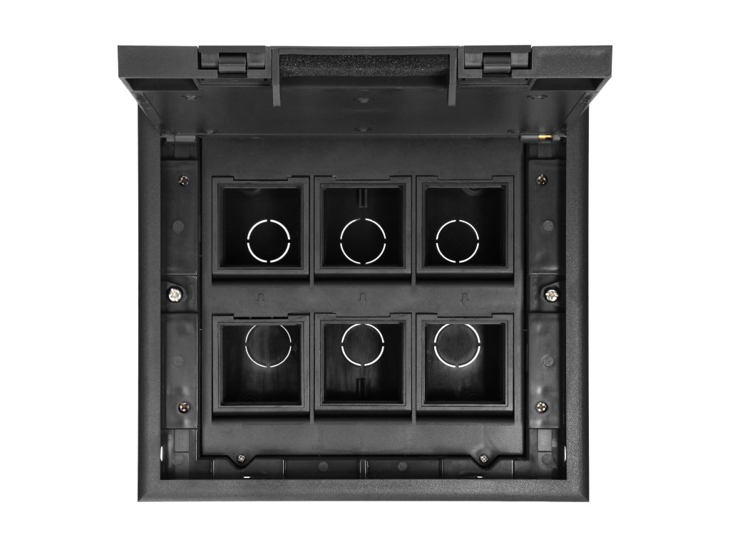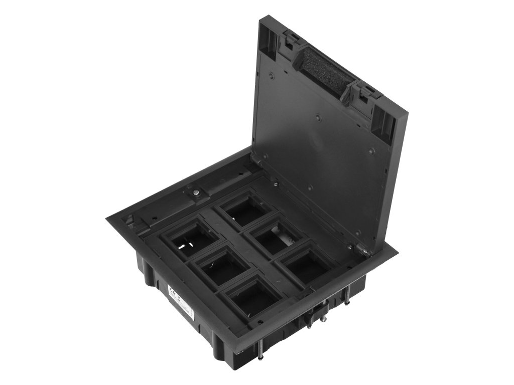 - Sigurno i praktično rješenje: Podna kutija za module 6x ili 12x, crna pruža sigurnost pri rukovanju elektroinstalacijama zahvaljujući preciznom dizajnu koji minimizira rizik oštećenja kabela ili nepovoljnih utjecaja prašine i nečistoća.