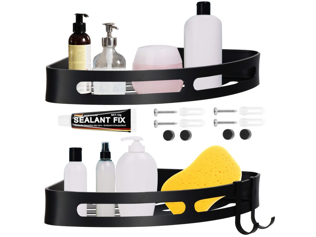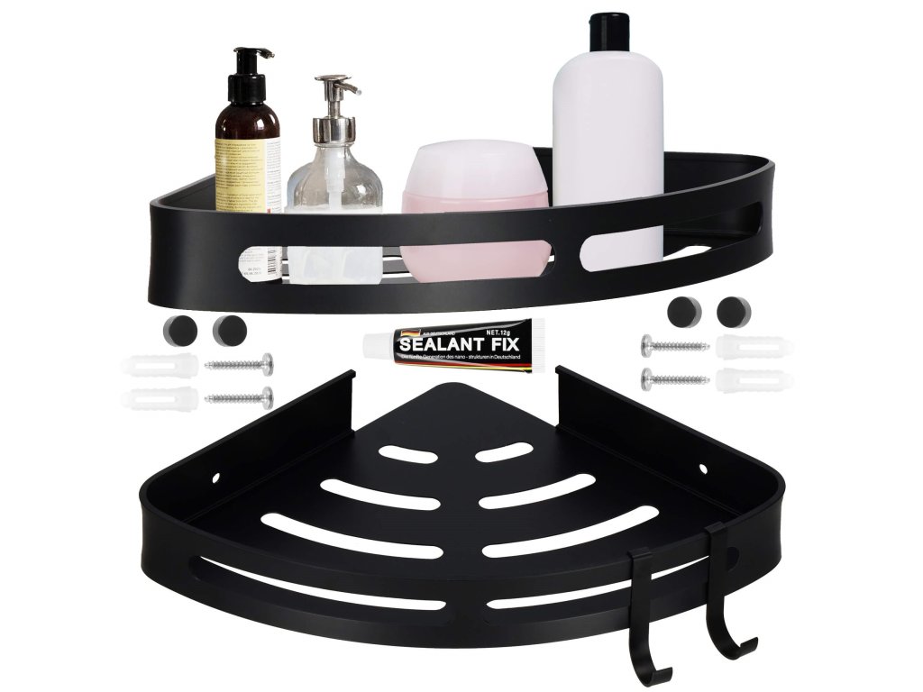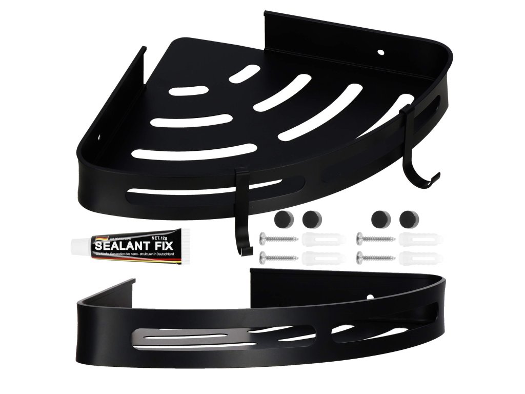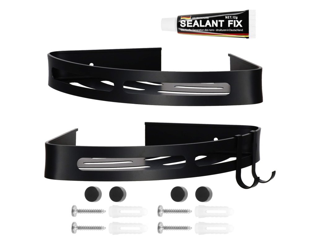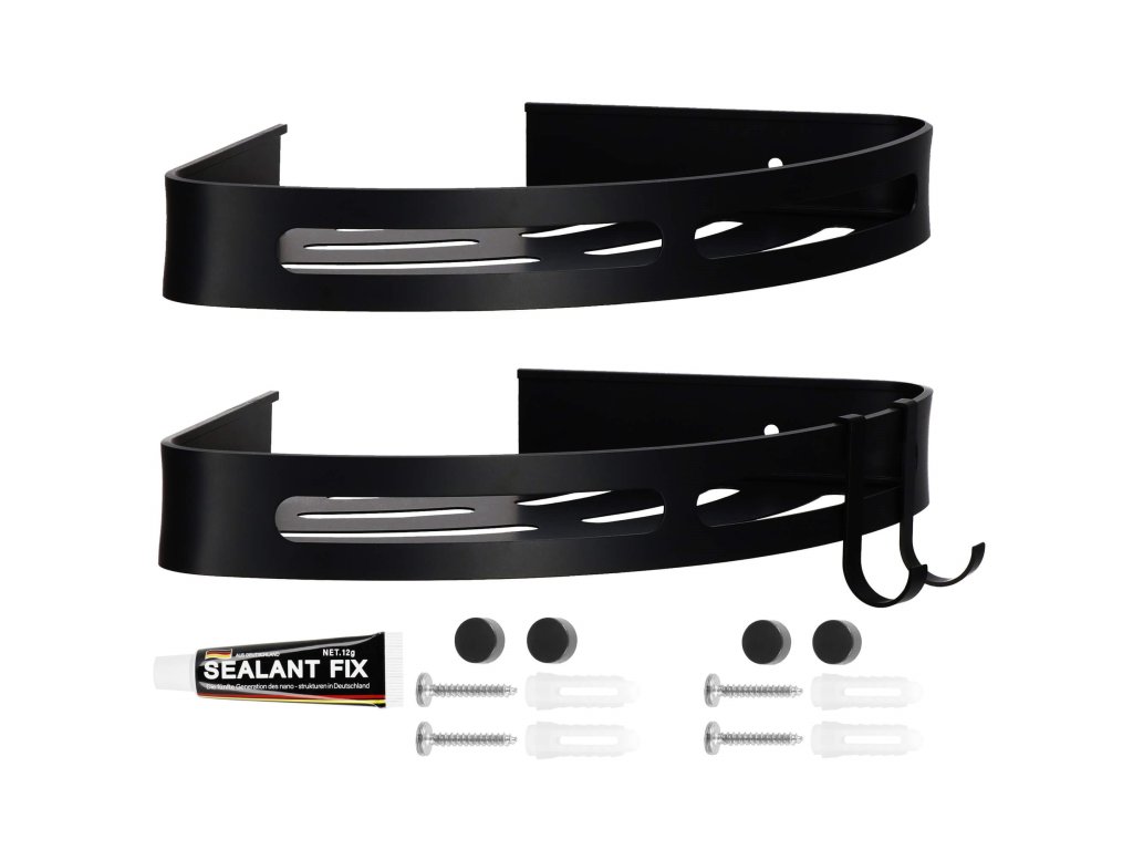 - Sada obsahuje: 2 police (nie je potrebné skrutkovanie), 4 skrutky na pripevnenie na stenu, lepidlo, montážny návod, 4 čierne krytky, 2 háčiky