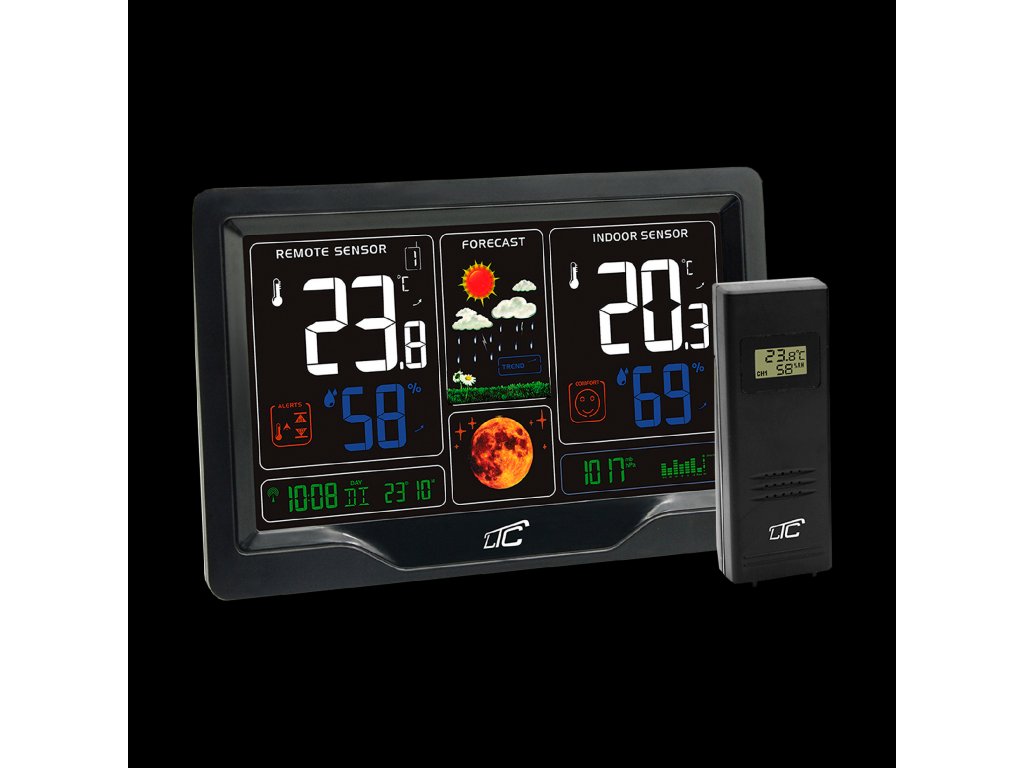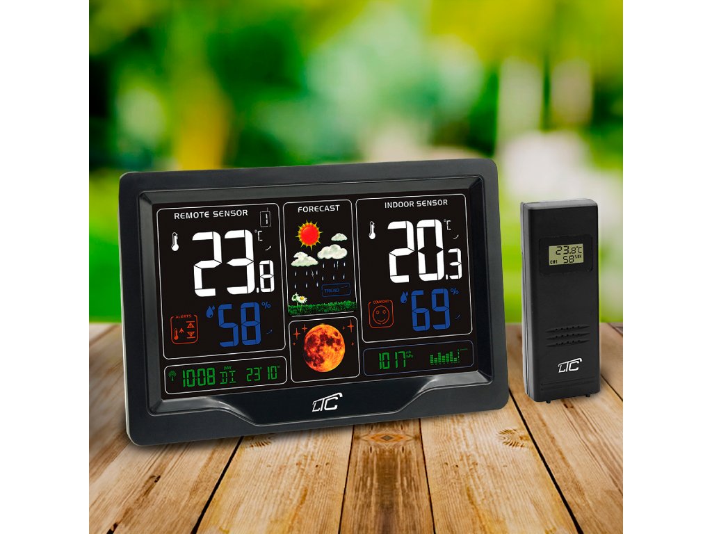 METEOSTANICA LTC S ŠARENIM VIŠEFUNKCIONALNIM DISPLEJEM CRNA Tražite pouzdanu i višenamjensku meteostanicu koja će vam pomoći u praćenju vremenskih uvjeta i osigurati udobnost u vašem domu Upoznajte našu najnoviju meteostanicu LTC sa šarenim displejem! Karakteristike uređaja: Statusi obavijesti o vremenu:: sunčano, djelomična naoblaka, oblačno, kišovito itd. Pokazatelj temperature i vlažnosti unutar ili izvan prostora.: Pokazatelj udobnosti: (pokazatelj optimalnosti vlažnosti i temperature u prostoru). Funkcija alarma i odgode. Pozadinsko osvjetljenje displeja. Podaci prikazani na uređaju: godina, mjesec, dan, sat, minuta, sekunda, temperatura, vlažnost. Mogućnost promjene formata prikazivanja vremena (format 12 / 24-satni). Pokazatelj 8 faza mjeseca.SPECIFIKACIJA: