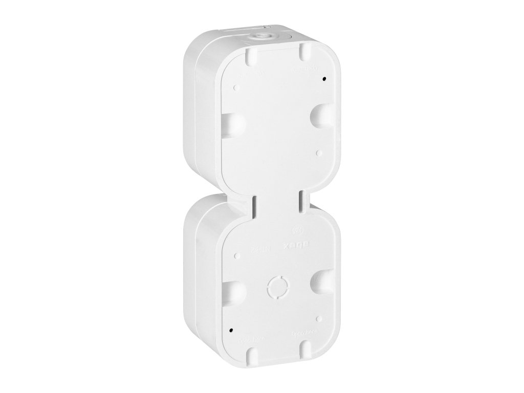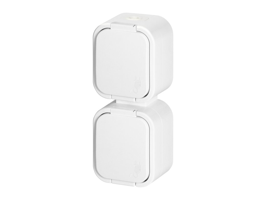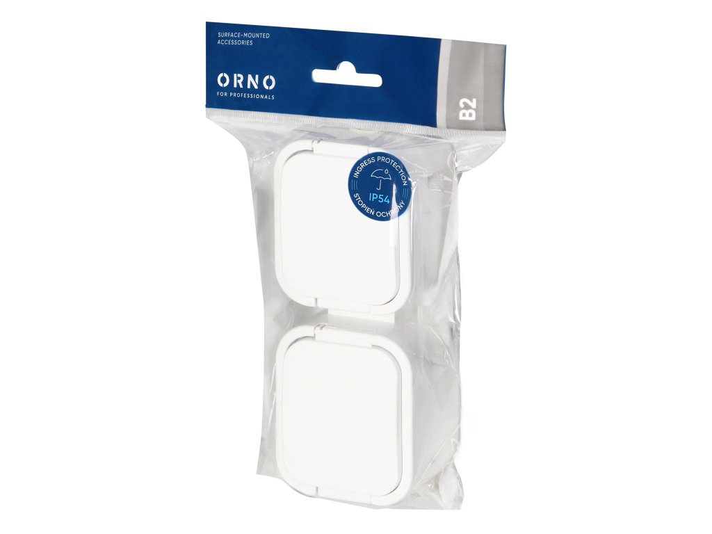 Serija utičnica i prekidača B2, s oznakom IP54, otporna na prašinu i vlagu. Serija se odlikuje bezvremenskim oblikom i robusnim kućištem. Idealna za instalaciju u industrijskim postrojenjima i kućama. Prekidači su opremljeni brzim priključcima, dok utičnice imaju tradicionalne vijčane priključke.Dvostruka, vertikalna francuska utičnica 2x2P+E, otporna na prskanje vode s poklopcem. Namijenjena za površinsku montažu. Bit će prikladna tamo gdje je potrebna zaštita od prašine i prskanja vode (IP54).