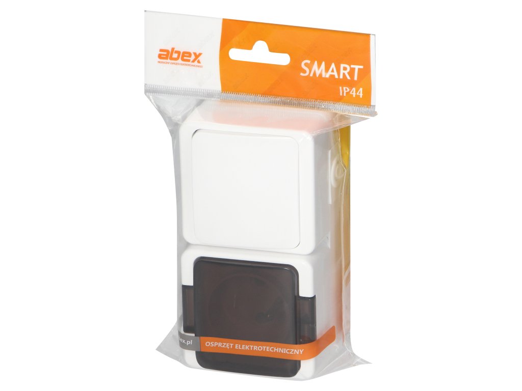 Površinski montirana jednostruka utičnica 2P+E s dimnim poklopcem + jednopolni prekidač, IP44, SMART, bijelaAdditional parameters