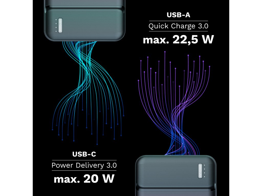 Power bank Kruger&Matz opremljen je funkcijom brzog punjenja. Ovisno o tome koji uređaj imate, možete iskoristiti tehnologiju Quick Charge (punjenje s USB priključka) ili Power Delivery s USB tipa C priključka. Dovoljno je nekoliko trenutaka i ponovno ste u kontaktu sa svijetom.