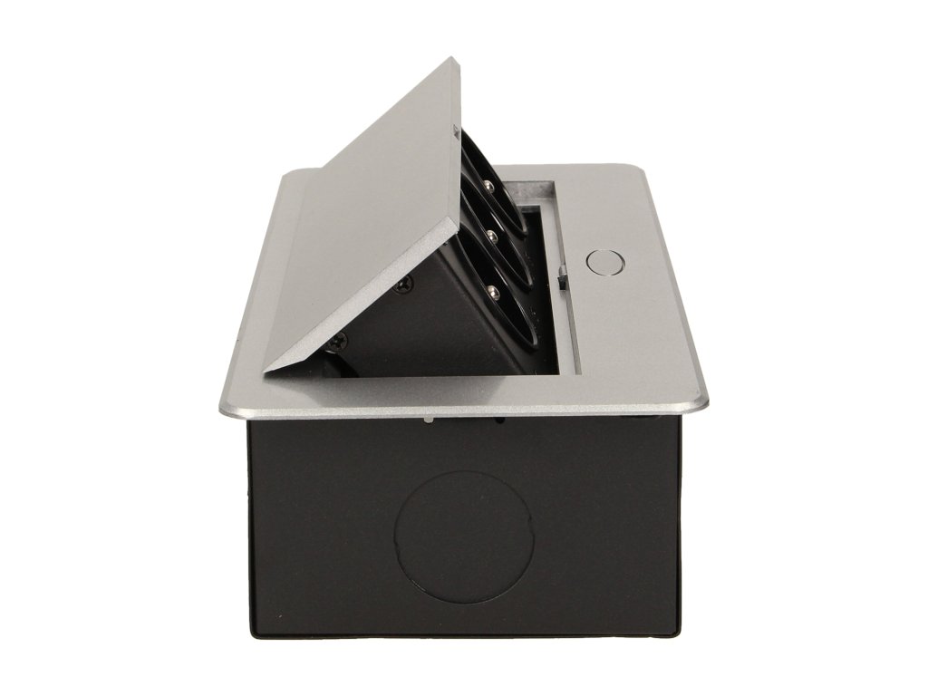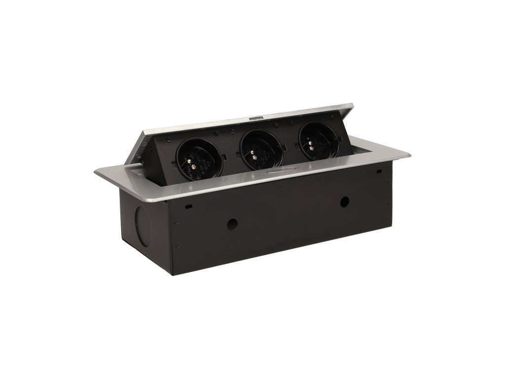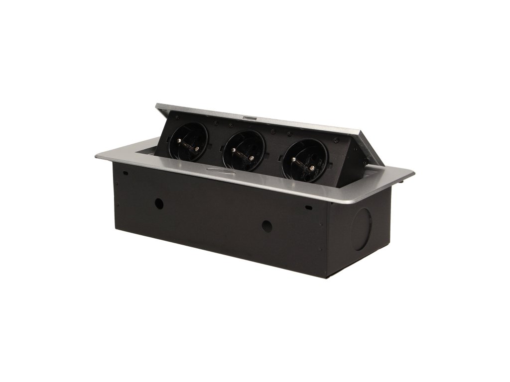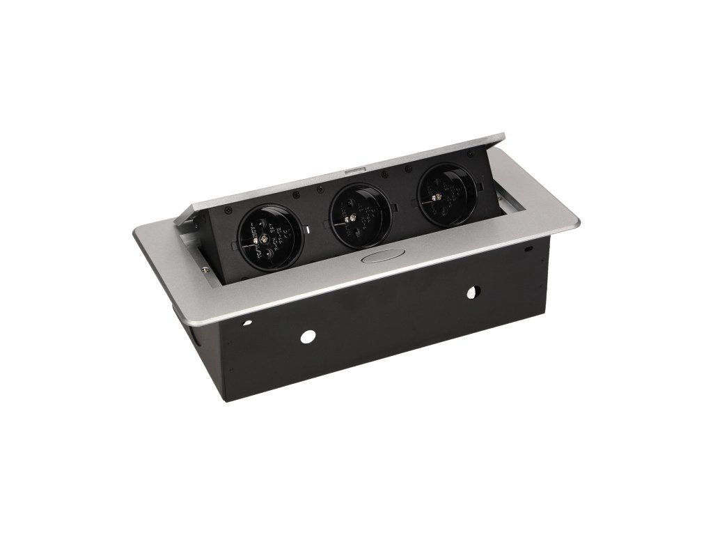 Set od tri električne utičnice 2P+Z u izvlačnom gornjem poklopcu. Namijenjene za unutarnju instalaciju u stolove, ploče stolova i stoliće u vertikalnom i horizontalnom položaju, pružajući pristup električnim utičnicama.Tehnička specifikacija: