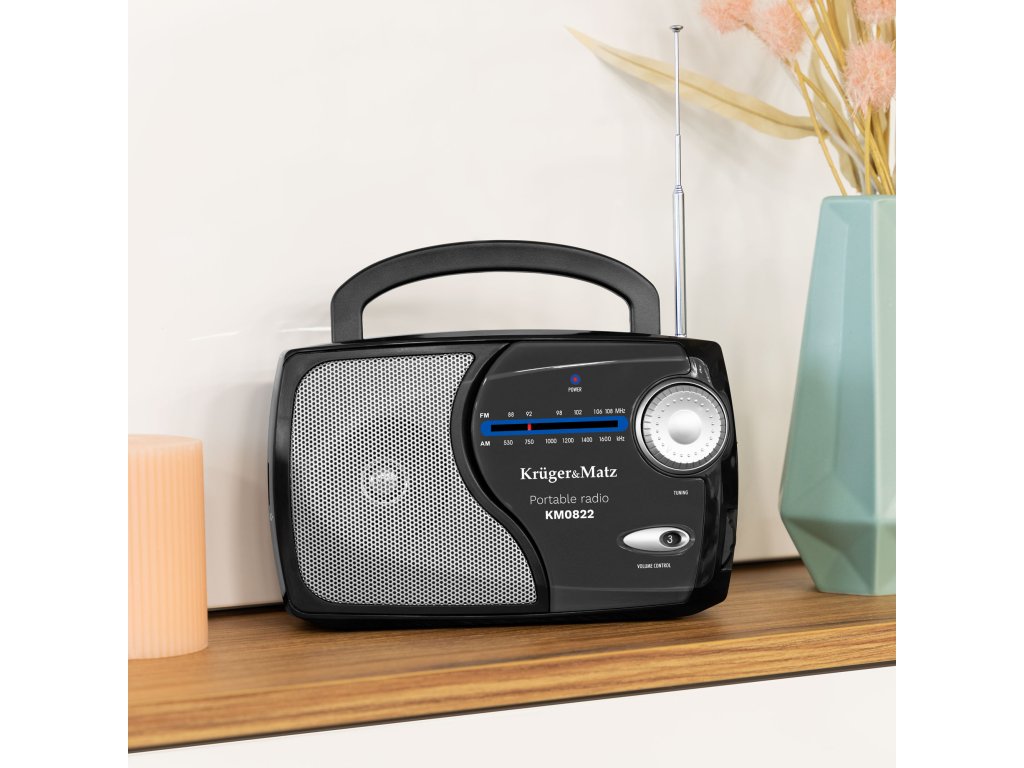 Kako i dolikuje prijenosnom radiju, mali radio KM 822 opremljeno je sklopivom ručkom koja olakšava prijenos uređaja, a također ima mogućnost napajanja iz mreže ili putem baterija. Takva funkcionalnost FM prijemnika Kruger&Matz omogućava da služi kao mali prijenosni radio koji lako možete ponijeti sa sobom na imanje, u vrt ili čak na kampiranje.