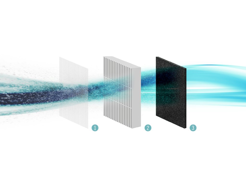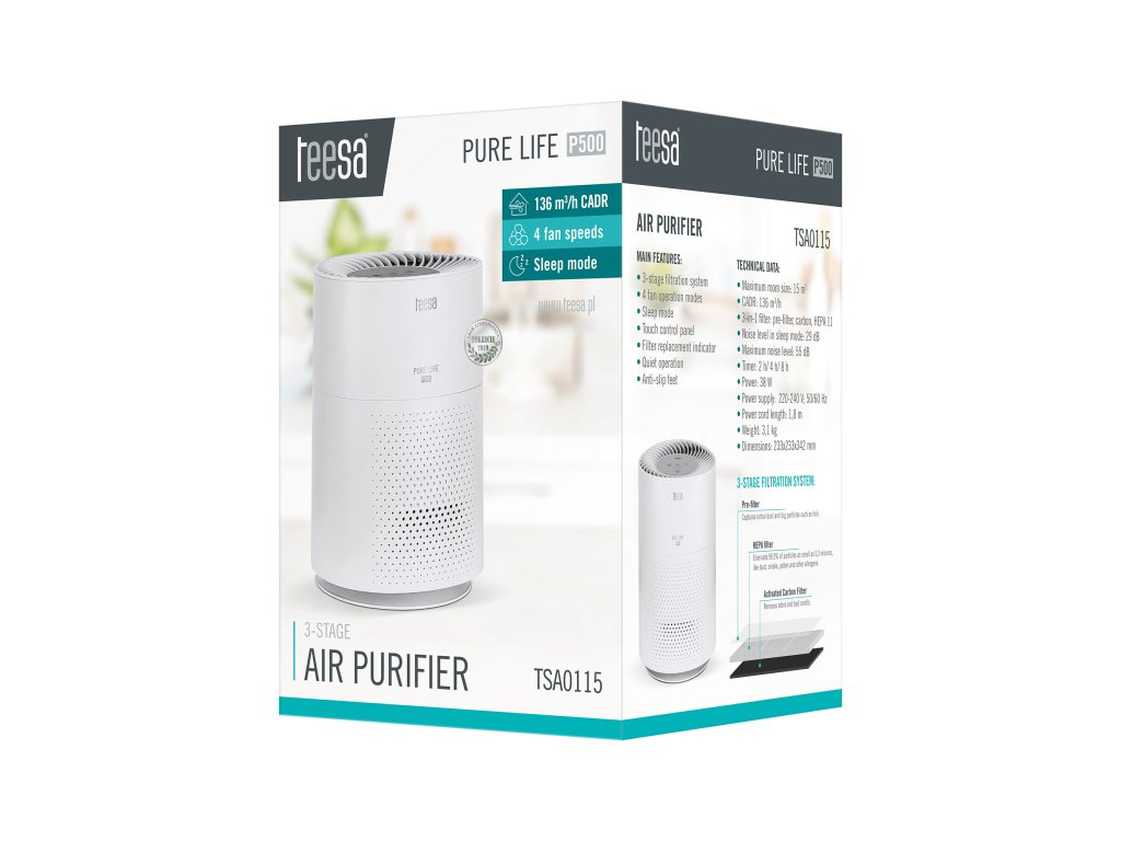 Pročistač Teesa Pure Life P500 koristi sustav filtera s tri stupnja. Prefilter uklanja veće nečistoće kao što su prašina i kosa, HEPA 11 filter uklanja do 99,5% čestica poput peludi i drugih alergena, dok ugljeni filter apsorbira štetne plinove i uklanja neugodne mirise.