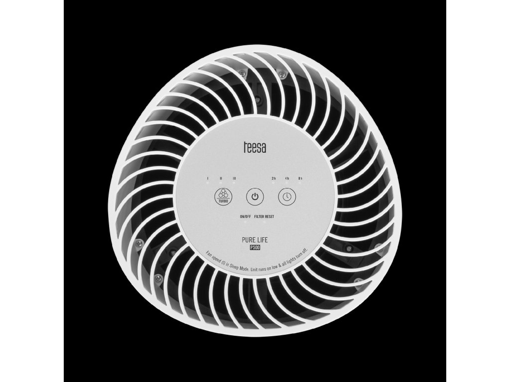 Izlaz očišćenog zraka nalazi se na vrhu pročistača Teesa, a zahvaljujući ovom položaju i prikladno oblikovanim lopaticama, zrak se ravnomjerno raspoređuje po cijeloj prostoriji. Prema vašim potrebama, možete birati između 4 načina rada pročistača: noćni, srednji, visoki ili turbo.