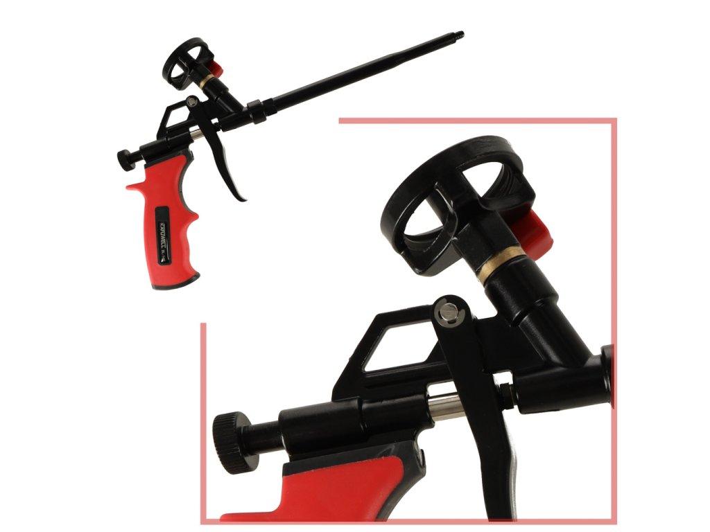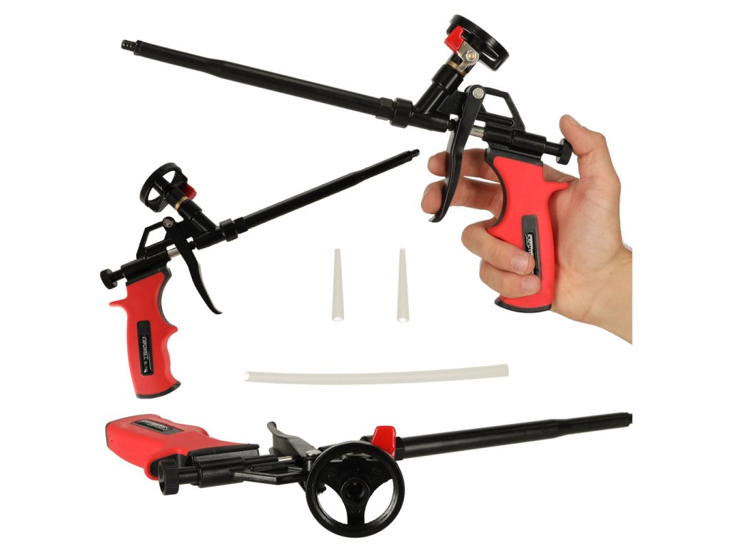 Pištoľ je kompatibilná s typickými nádobami na montážne peny, polystyrénové lepidlá a klasické čistiace prostriedky na pištole. Použité materiály sú trvanlivé a odolné voči poškodeniu a deformácii, čo zaručuje dlhodobú účinnosť výrobku.