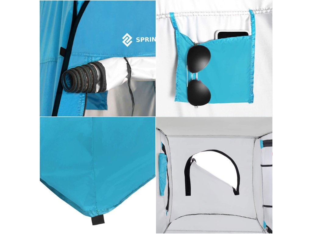 - Na svakom uglu zida na vrhu 4 pričvrsne točke kroz koje provlačiš užad i pričvršćuješ kabinu kako bi stajala stabilno i ne mahala na vjetru