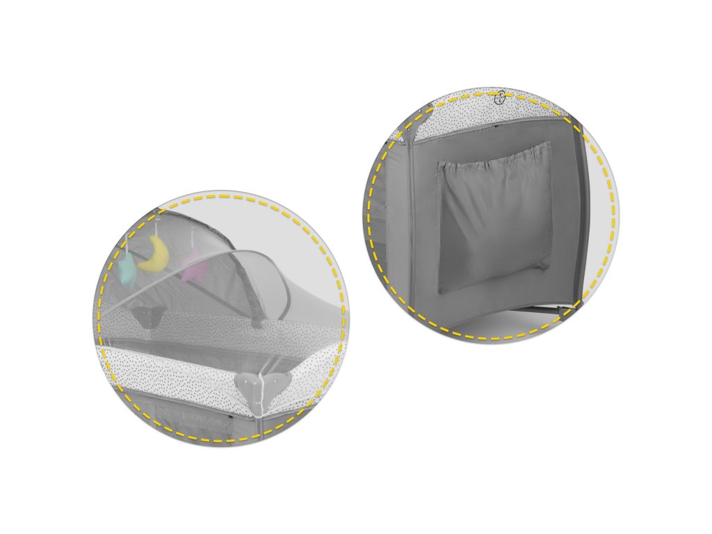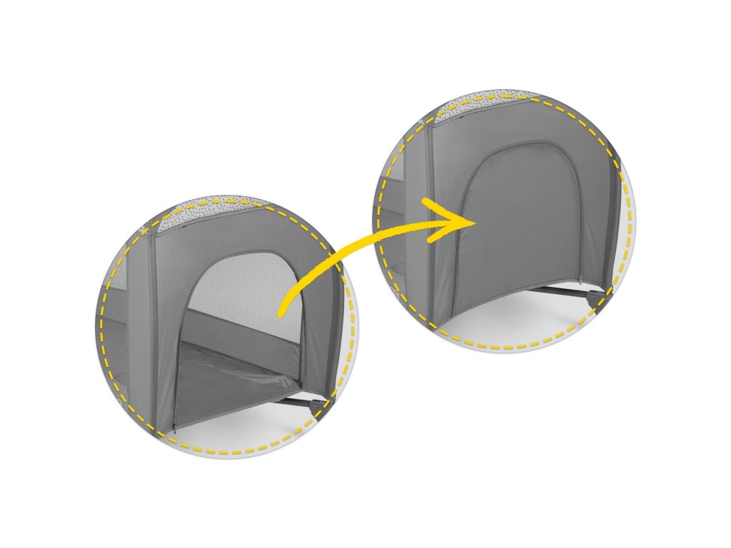 Uklonjivi bočni ulaz je za malu djecu neprohodan, zahvaljujući ziperu ušivenom s vanjske strane.S druge strane, starijoj, spretnijoj i pokretljivijoj djeci omogućuje samostalno, udobno i sigurno ulaženje i izlazak iz krevetića tako da neće pokušavati popeti se na gornji rub.