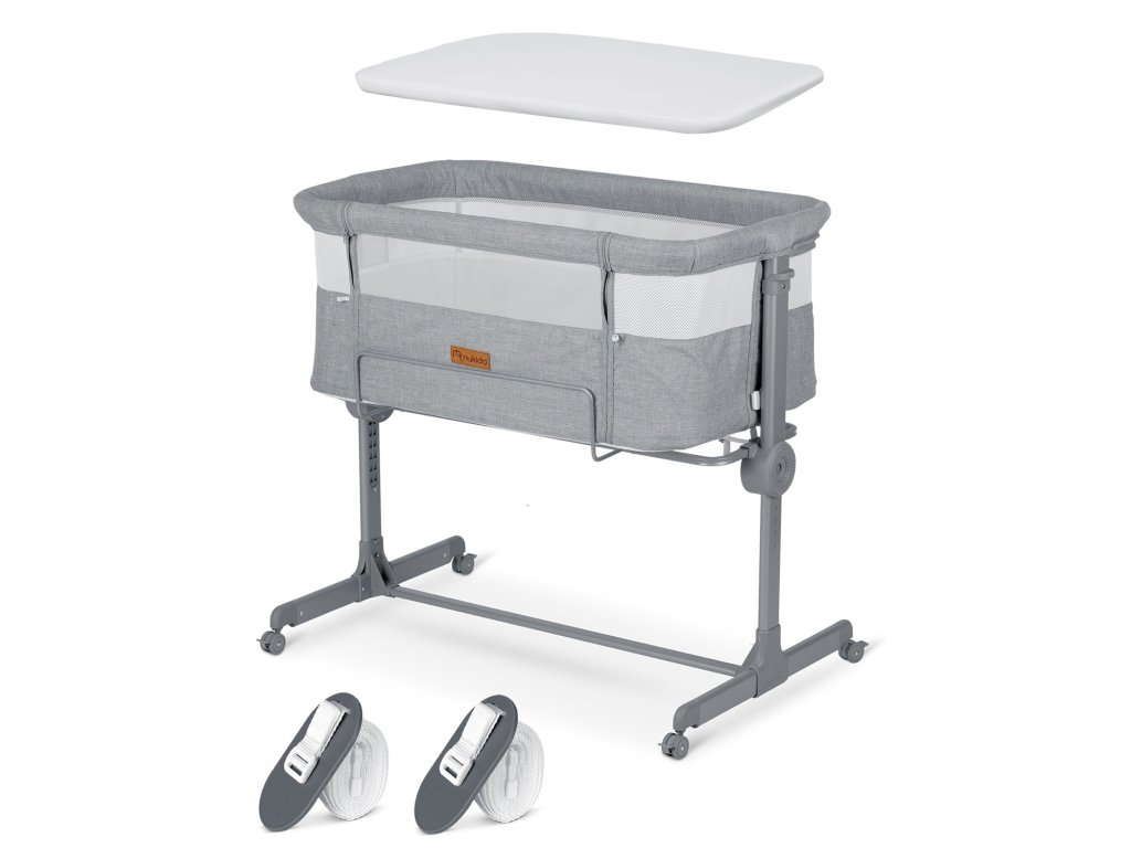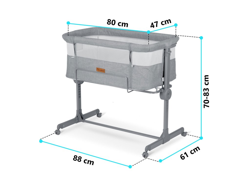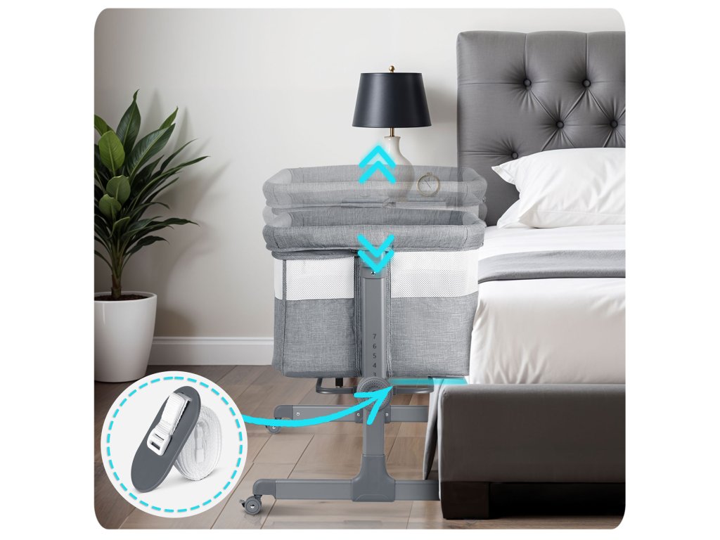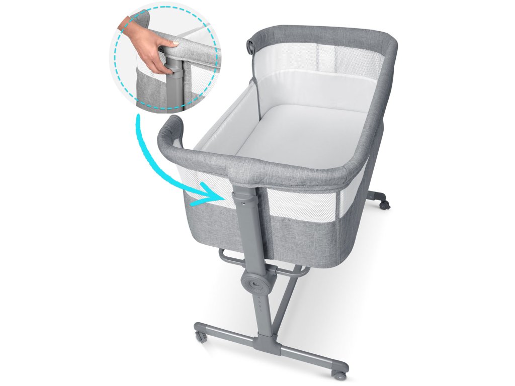 - Bočnica se može obostrano neovisno podešavati po visini, što omogućuje njezino prilagođavanje razini roditeljskog kreveta i osigurava udobnost za dijete i za roditelje.