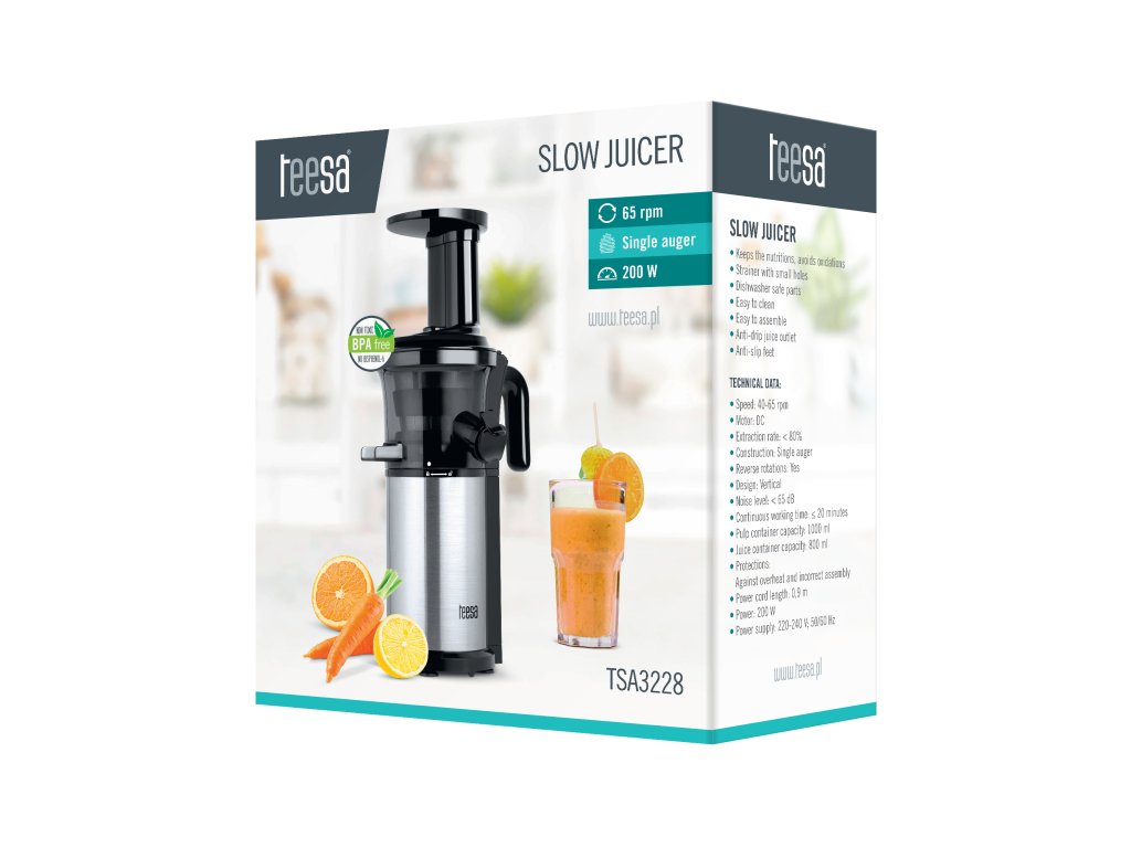 Volite započeti dan dozom vitamina Novi polako rotirajući sokovnik Teesa za voće i povrće ćete obožavati. Uređaj ne sadrži BPA - to znači da je izrađen bez materijala koji sadrže bisfenol, što je posebno važno za zdravstvene učinke iscijeđenog soka. Zahvaljujući vertikalnom dizajnu i kućištu od nehrđajućeg čelika, sokovnik ne zauzima puno mjesta na radnoj površini i savršeno se uklapa u uređenje moderne kuhinje.