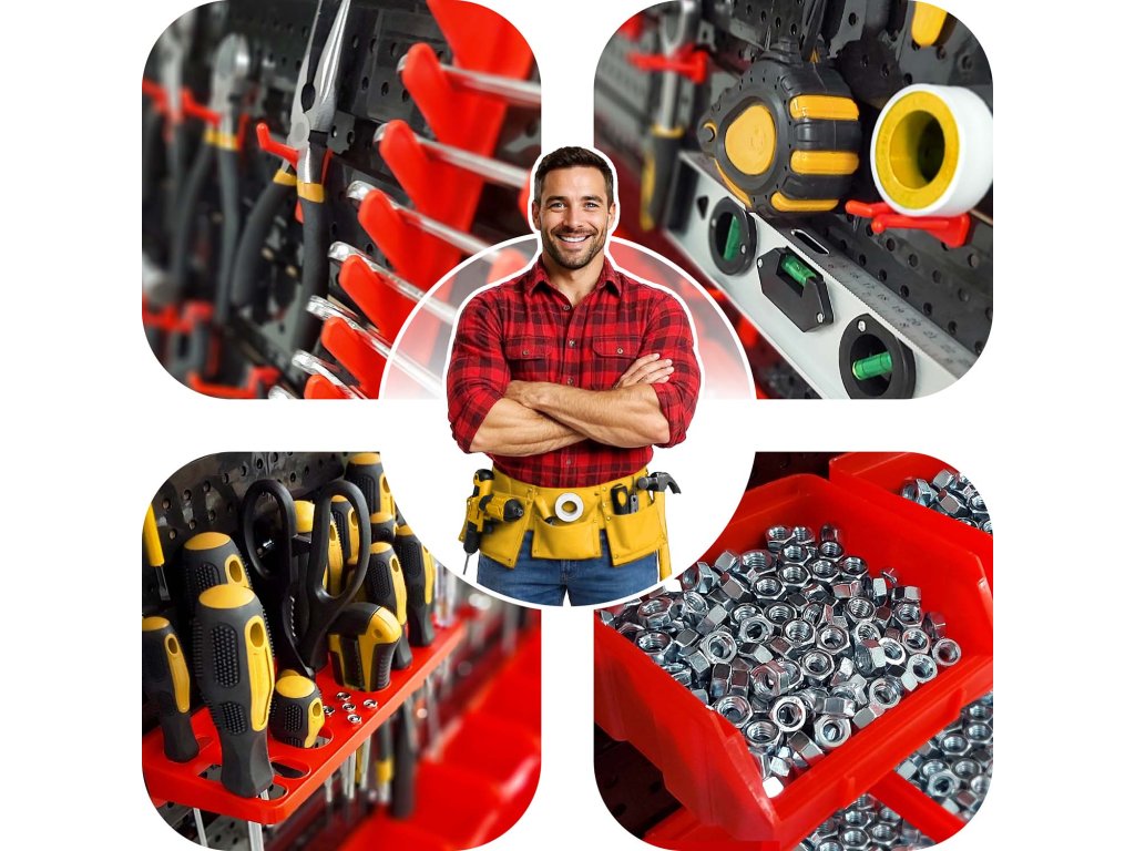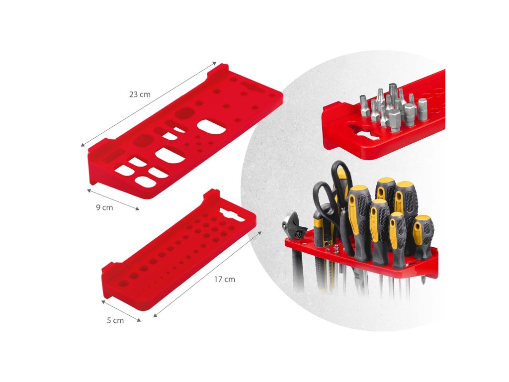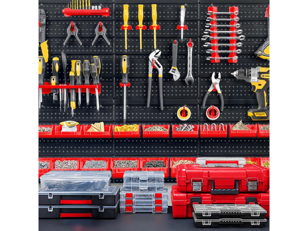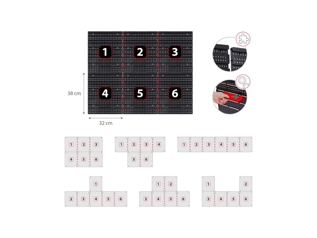 Ploča za alat ima modularnu konstrukciju, zahvaljujući kojoj možete slobodno kombinirati panele i prilagoditi raspored svojim potrebama. Jednostavna montaža omogućuje brzo i udobno povezivanje pojedinačnih dijelova, a razne kombinacije osiguravaju fleksibilnost u organizaciji radnog prostora.