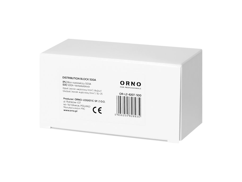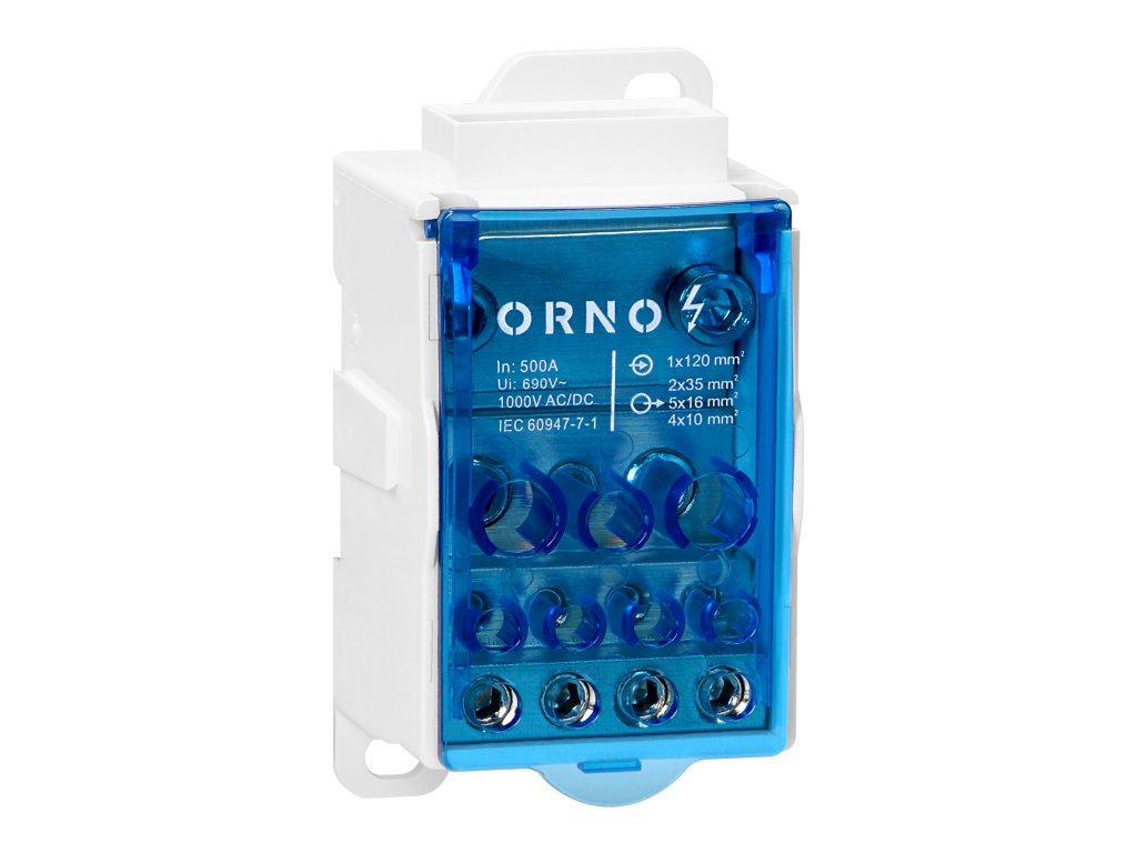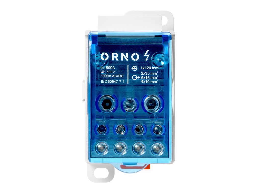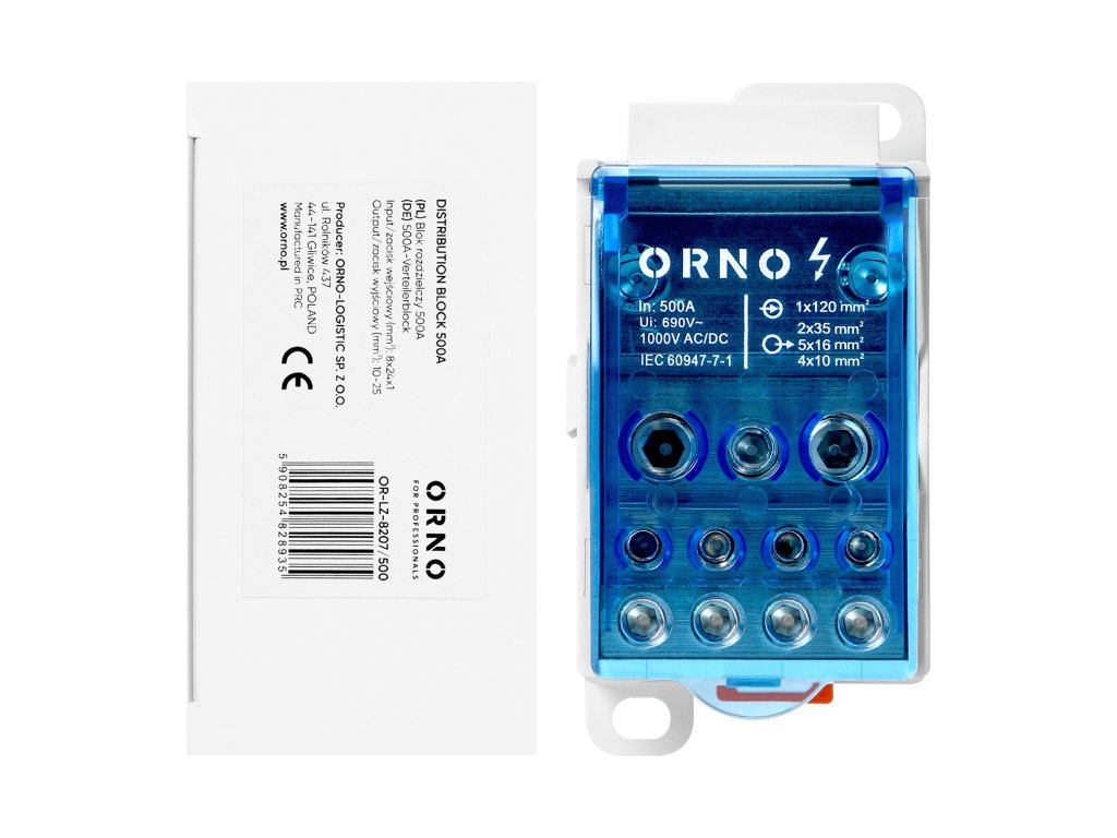 Blok za distribuciju električne energije s strujom od 500A opremljen je ulaznim stezaljkama 1x8-24 mm i izlaznim stezaljkama 4x10mm , 5x16mm i 2x25mm . Dimenzije uređaja su 96x49x50mm. Razdjelni blokovi ORNO dizajnirani su da omogućuju proširenje s mogućnošću kreiranja složenijih električnih veza i distribucije. Stezaljka razdjelnog bloka ima stupanj zaštite protiv prodora IP20 i opremljena je plavim prozirnim poklopcem.