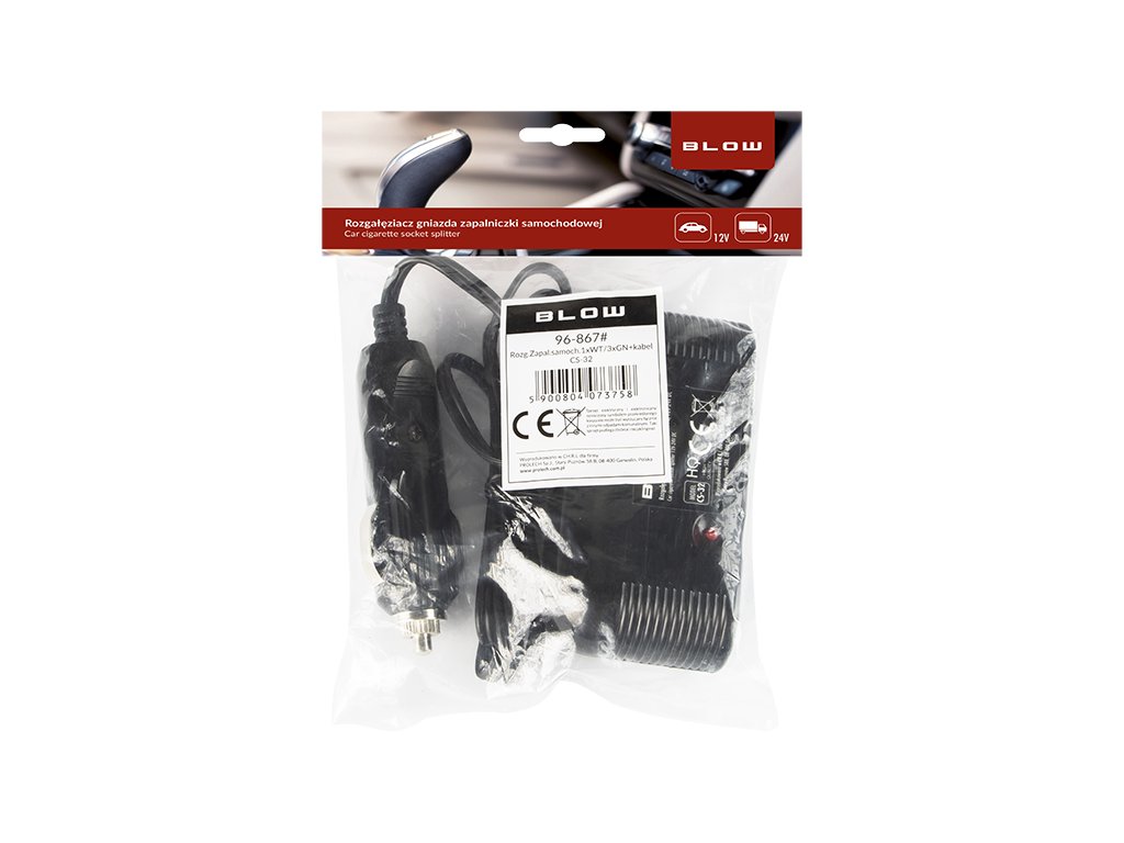 Auto upaljač razdjelnik utičnica za 3 utičnice na kabelu CS-32Razdjelnik je namijenjen za instalaciju 12V i 24V u automobilu. Utikač je prikladan za standardne utičnice automobilskih upaljača promjera 21 mm. Razdjelnik ima zaštitu od kratkog spoja u obliku zamjenjivog brzog staklenog osigurača WTA.