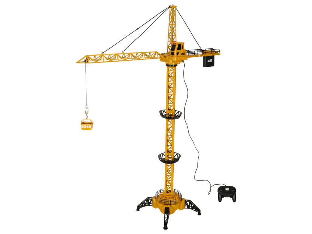 Žuto-crni kran na daljinsko upravljanje pomoću daljinskog upravljača koji je dio seta.