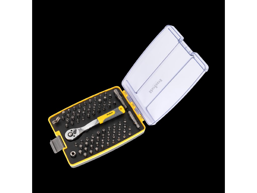 Zahvaljujući 80 različitih bitova raznih oblika i veličina, lako ćete se nositi s gotovo svim vrstama vijaka i šarafa. Nastavci različitih promjera i duljina omogućuju udoban rad čak i na teško dostupnim mjestima. Dodatni adapteri povećavaju kompatibilnost seta s drugim alatima, čineći ga još univerzalnijim.