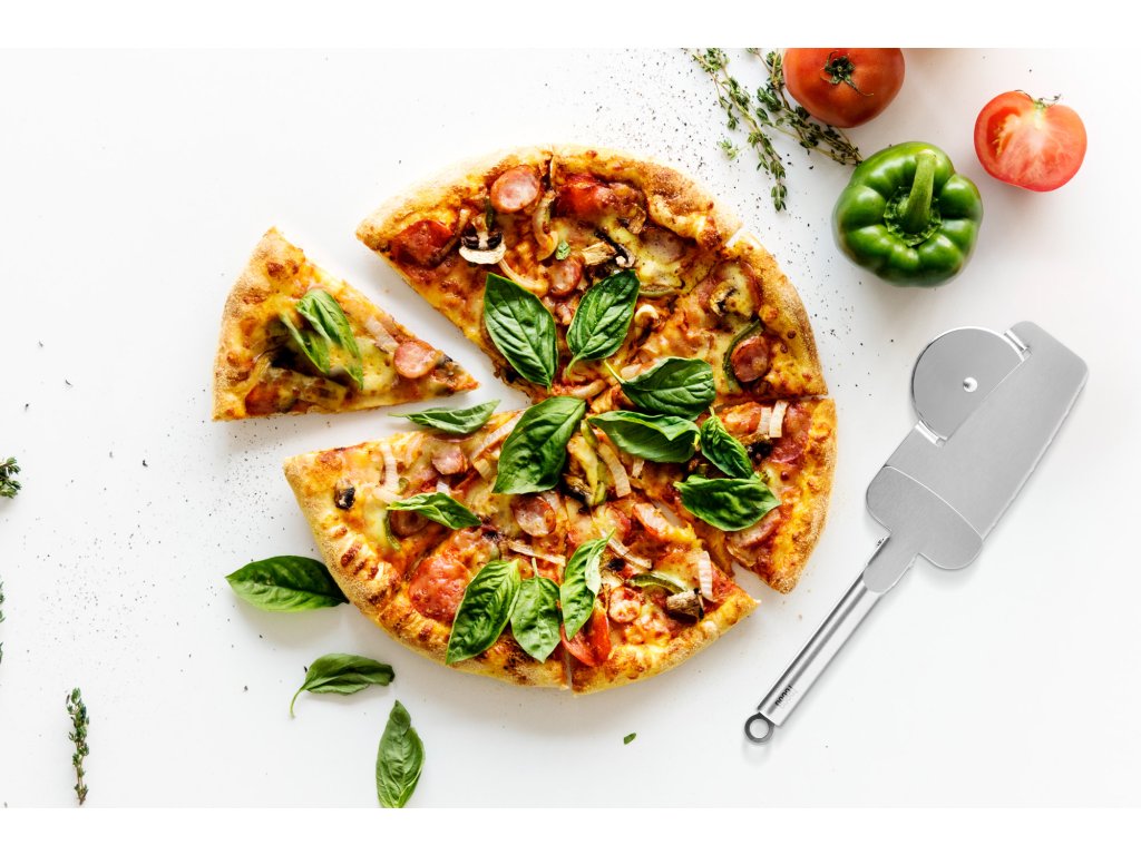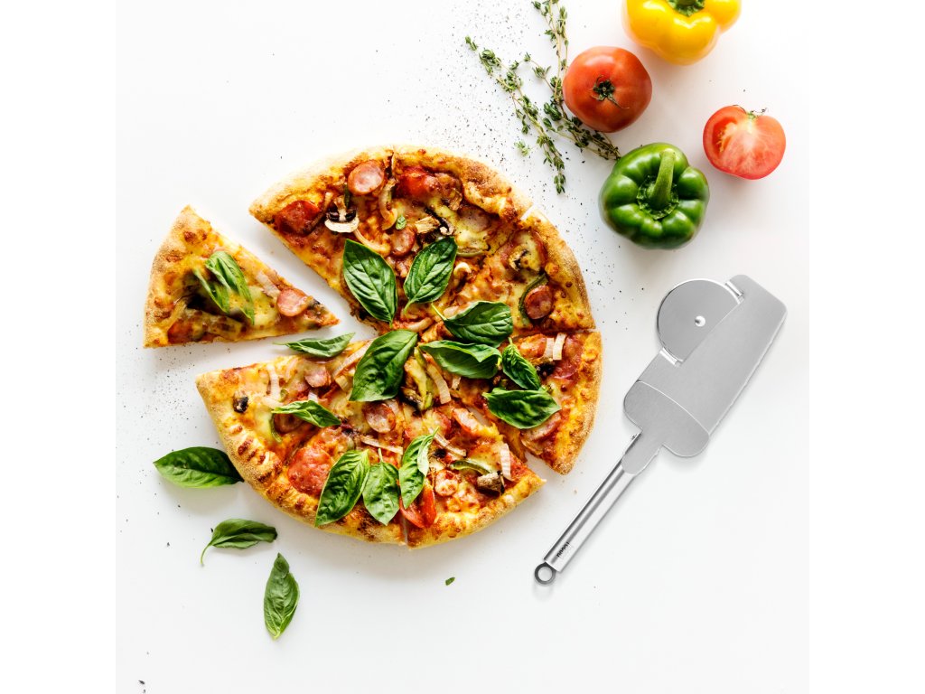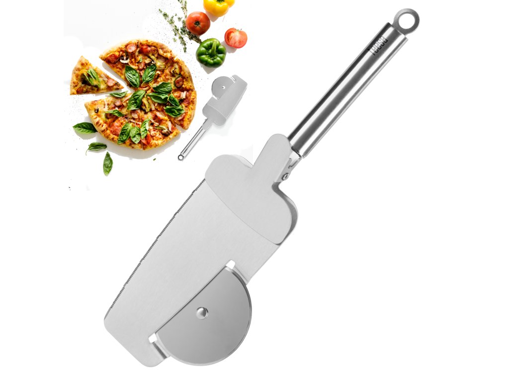 4u1: rotirajući nož, lopatica za podizanje komada pizze s nazubljenim rubom, kliješta za držanje
