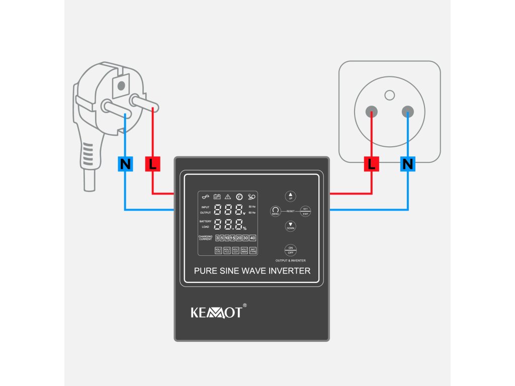 Izvori za hitne slučajeve KEMOT PROSinus opremljeni su jasnim LED zaslonom koji prikazuje trenutni radni status uređaja. Na zaslonu, između ostalog, možete provjeriti: ulazni napon, izlazni napon i frekvenciju. Osim toga, možete brzo provjeriti razinu opterećenja i razinu baterije.