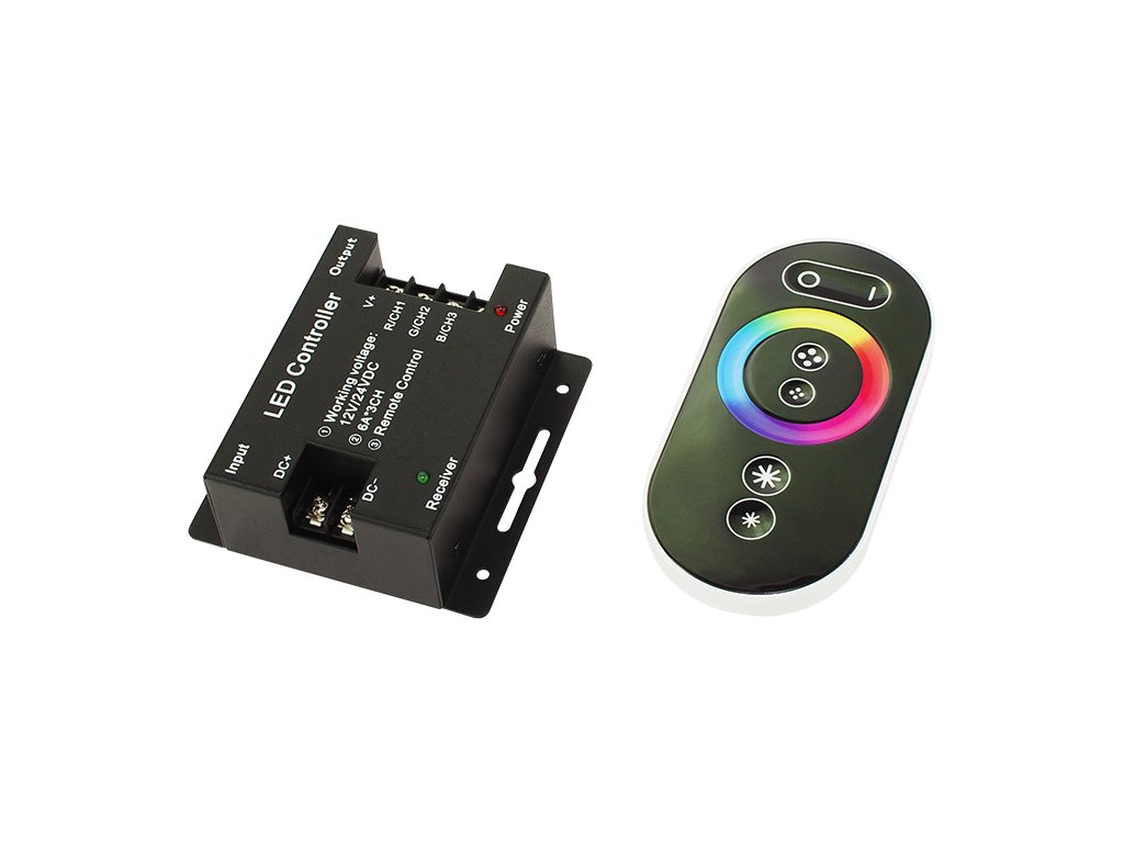 Bežični daljinski upravljač povezuje se s kontrolerom putem radija. Zahvaljujući tome, ne morate nišaniti ni na jedno mjesto i rasvjetu možete upravljati iz druge prostorije. Klizanjem prsta po obojenom dodirnom prstenu možete glatko promijeniti boju rasvjete RGB LED trake biranjem bilo koje boje svjetla iz cijele palete boja dugine svjetlosti.- Radni napon: 12V/24V DC - Izlazi za kontrolu: krugovi (R/G/B) - Kontrolna struja: 6A/krug - Način povezivanja: zajednička anoda.