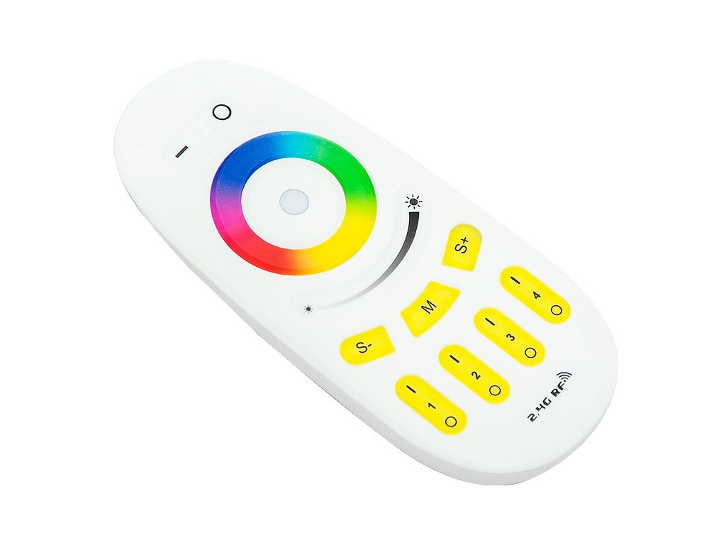 Daljinski upravljač 4 RGB+W LED zoneDaljinski upravljač namijenjen je za prijamnike Mi.Light RGB i RGBW koji rade na frekvenciji od 2,4 GHz. Daljinski upravljač može upravljati s četiri neovisne LED zone, a u svakoj zoni može biti mnogo LED traka i nekoliko prijamnika Mi.Light. Pomoću daljinskog upravljača možemo uključivati i isključivati odabrane LED zone te kontrolirati svjetlinu, a pomoću kruga i boju osvjetljenja. Osim toga, daljinski upravljač ima unaprijed programirane sekvence treperenja i promjene boja koje se mogu aktivirati bilo kada. Domet do 30 m i radijsko upravljanje omogućuju udobno korištenje bez potrebe usmjeravanja daljinskog upravljača prema prijamniku. Za ispravan rad potreban je barem jedan prijamnik.