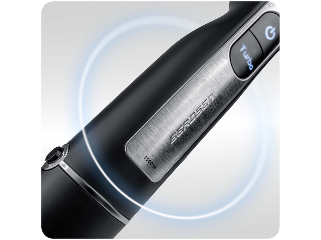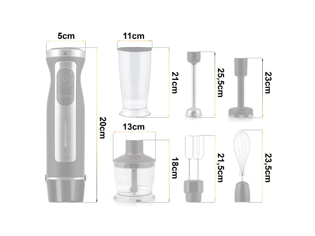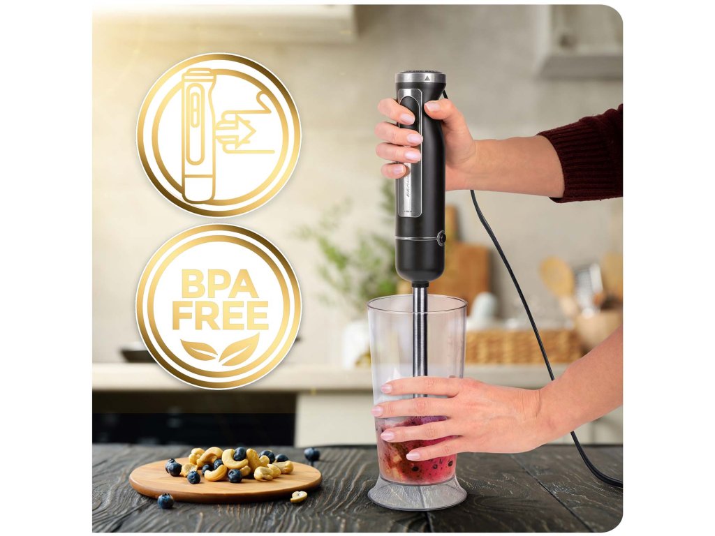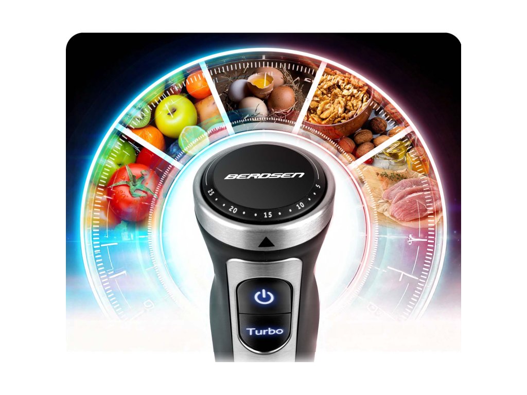 Super moćan blender 1500 W, s punim setom dodatne opreme ## Berdsen 375400 ## Odaberite snagu, stil i pouzdanost — odaberite blender stvoren za kulinarske majstore!## Prednosti proizvoda: ## ? Impresivna snaga s TURBO funkcijom — miješa najtvrđe sastojke. ? Pouzdan i efektan titanski nož — preciznost i izdržljivost. ? Bogati set višenamjenske dodatne opreme — kompletna podrška u kuhinji. Čak 6 različitih funkcija! ? Izvrsna kvaliteta i elegantan dizajn — elegantan izgled premium čeličnih detalja i mat finiš. ## ????? Snažan titanijski nož GOLD ## Titanijski nož GOLD ističe se izuzetnom tvrdoćom i otpornošću na koroziju, što rezultira znatno dugotrajnijim vijekom trajanja blendera. ## Zahvaljujući visokoj otpornosti titana, nož se lako nosi s najtvrđim sastojcima, omogućujući brzo i učinkovito blendanje. Glatka površina noža olakšava čišćenje i održavanje higijene, osiguravajući nesmetano korištenje svakodnevno. ## Osnovni dodatak za blendanje ## Služi za miješanje i drobljenje sastojaka u glatku masu. Idealno za pripremu krem juha, umaka, smoothieja ili povrtnog pirea. ## Dodatak za miješanje/pire ## Namijenjen je za gnječenje i miješanje mekih sastojaka, poput krumpira, batata ili drugog povrća. Pomaže u postizanju ujednačene konzistencije pirea. ## Sjeckalica ## Namijenjena je za sjeckanje i mljevenje tvrdih sastojaka, poput orašastih plodova, luka, mesa ili začinskog bilja. Omogućuje brzo pripremu nadjeva, pasti i sitno sjeckanih sastojaka. ## Dodatak za blendanje s čašom ## Služi za miješanje i drobljenje sastojaka u glatku masu. Idealno za pripremu koktela, smoothieja, umaka i krem juha. Dodatak za miješanje ## Namijenjen je za izradu tijesta, miješanje sastojaka za kolače te pripremu masa ujednačene konzistencije. Dodatak za miješanje/žičana pjenjača ## Služi za miješanje šlaga, bjelanjaka, krema i laganih kolača, poput biskvitnih. ## Izuzetno moćan motor — čak 1500 W!## Snažan motor snage 1500 W, s turbo funkcijom, osigurava brzo i učinkovito blendanje, čak i kod najtvrđih sastojaka. ## Turbo funkcija omogućava trenutni porast snage, olakšavajući drobljenje ili miješanje velikih količina sastojaka u kraćem vremenu. ## 25 razina brzine i Turbo gumb. ## Blender nudi čak 25 razina brzine s glatkom regulacijom te dodatni TURBO mod, osiguravajući maksimalnu kontrolu i brzinu blendanja. ## Tehnički podaci ## Nazivna snaga: 1500 W ## Maksimalna brzina okretaja: 17.250 okretaja/min ## Napajanje: 220-240 V ## Materijal: čelik i plastika (BPA free) ## Zaštita od nepravilnog sastavljanja ## Zaštita od pregrijavanja ## Titanijski nož ## Kapacitet posude s poklopcem: 800 ml ## 25 razina brzine ## Dužina kabela: 1,3 m ## Neto težina: 1,55 kg ## Certifikati: CE, REACH, ROHSDodatni parametri