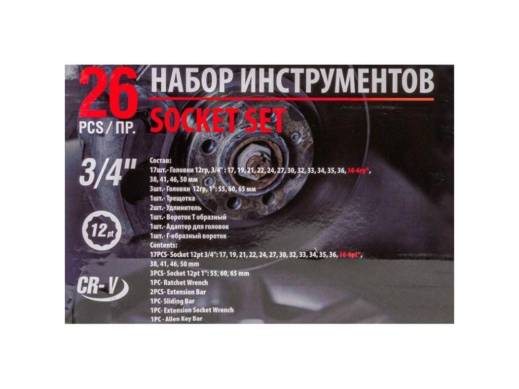 - Nastavci 12-uglasti 3/4" - 17 kom: 17 mm, 19 mm, 21 mm, 22 mm, 24 mm, 27 mm, 30 mm, 32 mm, 33 mm, 34 mm, 35 mm, 36 mm, (36 mm - 6-ugao), 38 mm, 41 mm, 46 mm, 50 mm
