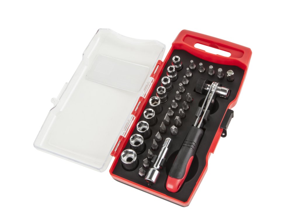 Zestaw zawiera: nasadki: 4; 4,5; 5; 6; 7; 8; 9; 10; 11 mm bity: płaskie: 3; 4; 4,5; 5; 5,5; 6; 7 krzyżowe typ PH: PH0; PH1; PH2; PH3; PH4 TORX: T10; T15; T20; T25; T27; T30 kwadratowe typu ROBERTSON: S0; S1; S2; S3 klucz grzechotka 1/4" przedłużacz 50mm przejściówka z uchwytu sześciokątnego pod nasadkiZestaw zawiera:
