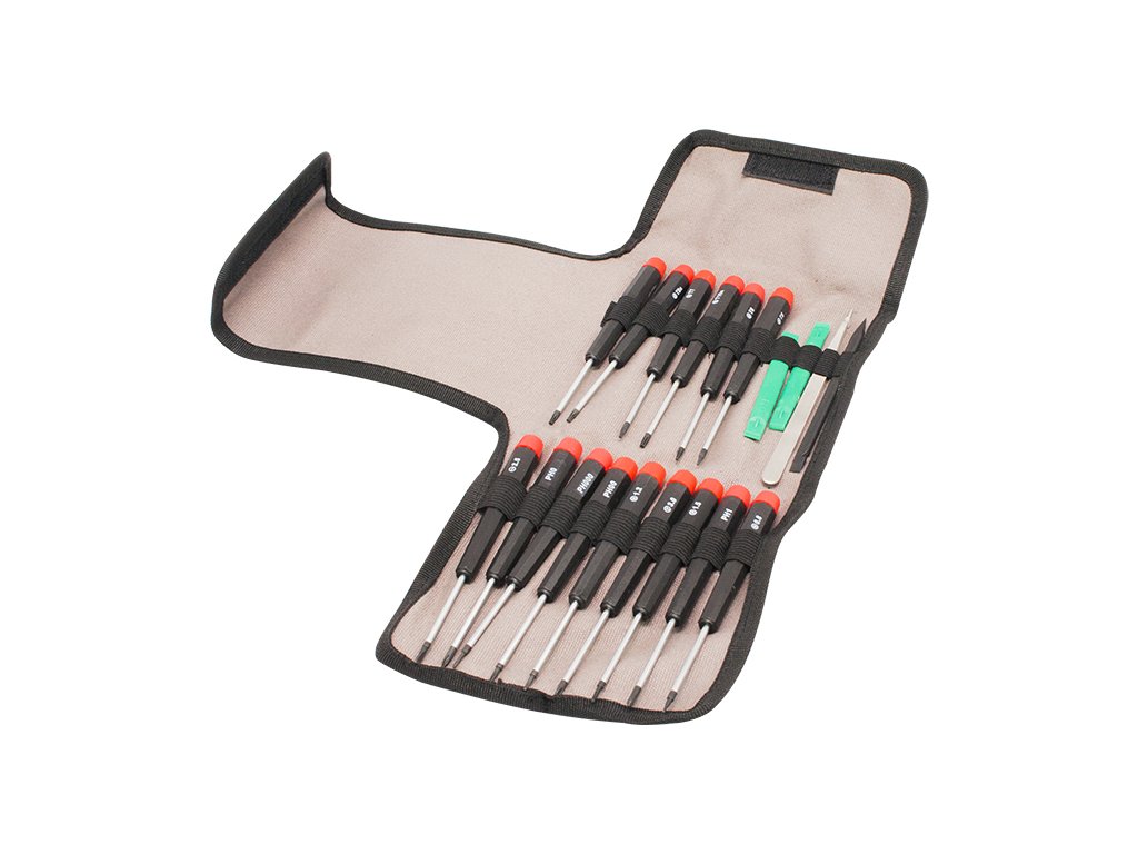 Set preciznih odvijača i drugih alata namijenjenih za razne vrste servisnih radova. Odvijači su opremljeni udobnim ručkama za jednostavno rukovanje.