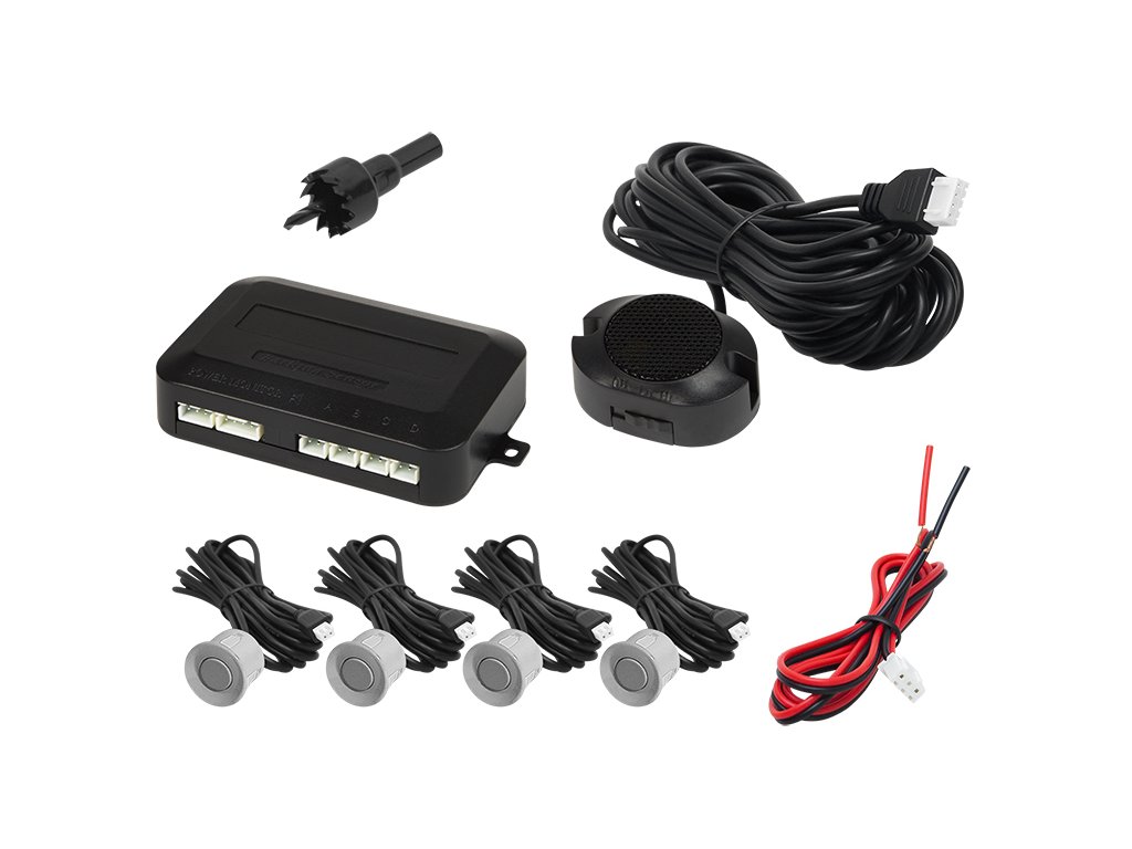 Također sadrži potrebne kabele, pribor i kontrolnu ploču Paket sadrži:Četiri ultrazvučna senzora u srebrnoj bojiZujaloKontrolna pločaOsnovno ožičenje i priborBušilica s pilom za otvoreUpute za korištenje i montažu na poljskom jeziku .