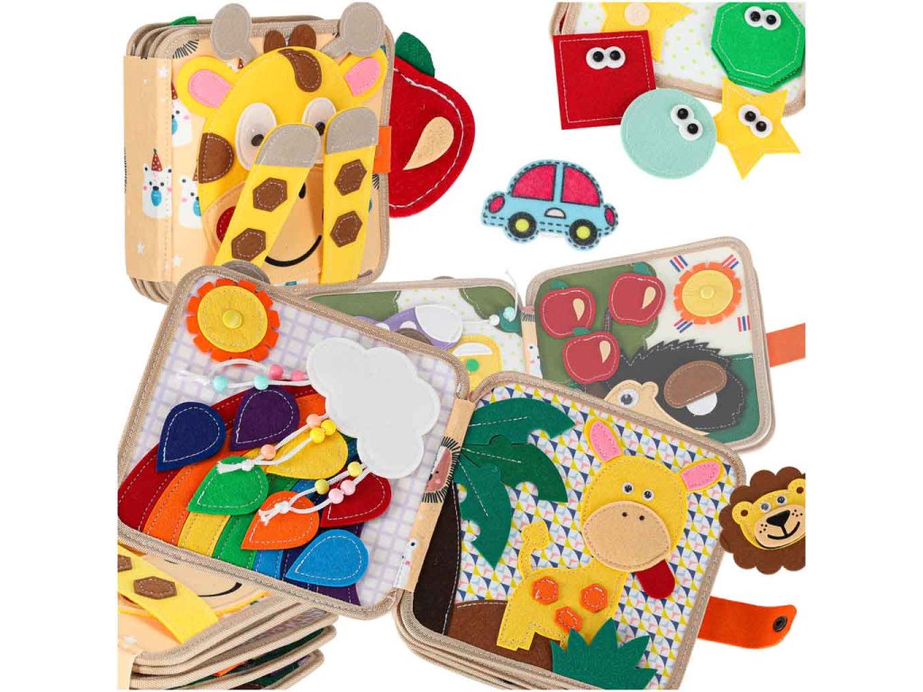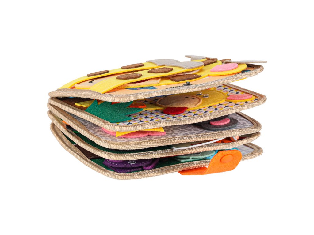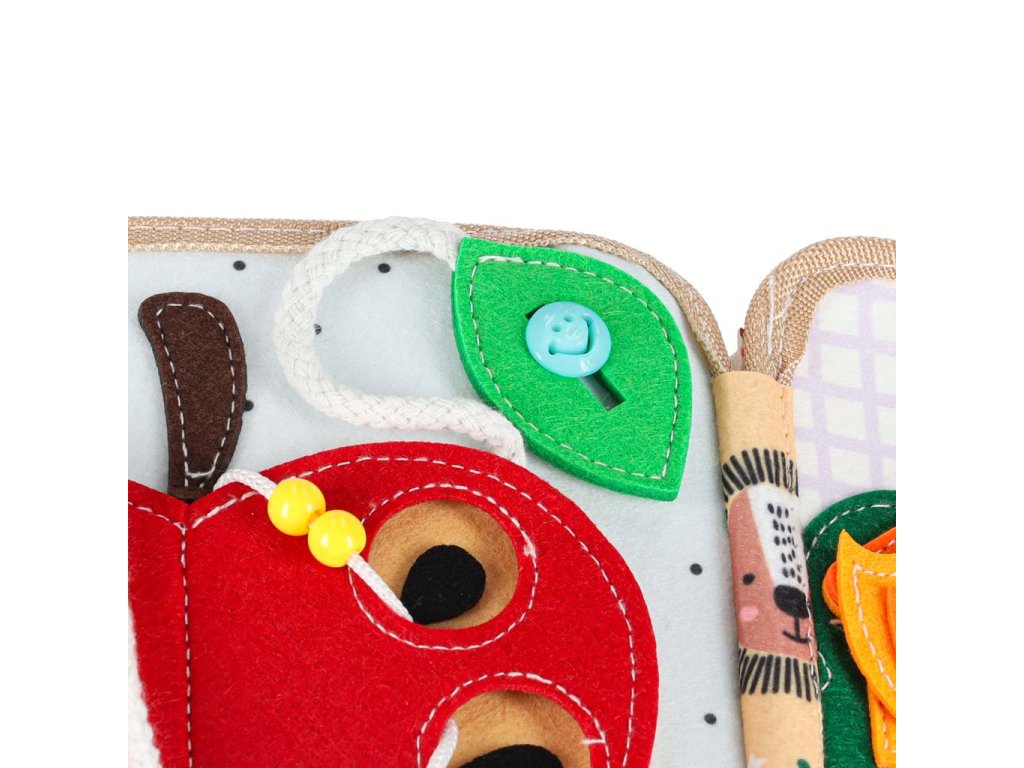 Edukativna taktilna ploča u obliku dječje knjige pomaže malom djetetu na pristupačan način upoznati svijet. Zanimljivi oblici i boje elemenata lako potiču dječju znatiželju i podržavaju interakciju s igračkom.