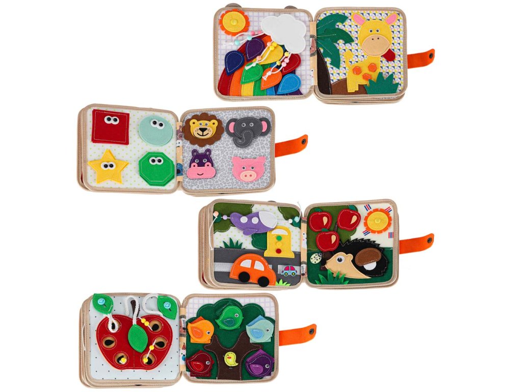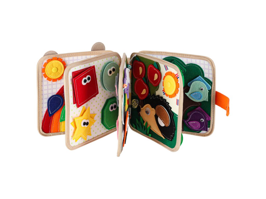 Sadržaj knjige ispunjen je raznim elementima u obliku geometrijskih oblika, životinja, biljaka ili vozila. Neki od njih pričvršćeni su za knjigu čičak trakom, koja se može sigurno odvojiti i ponovo složiti. To pomaže u razvijanju fine i grube motorike djeteta, kao i njegovih ruku. Zahvaljujući knjizi, malo dijete također uči prepoznavati boje, oblike i prirodne pojave.