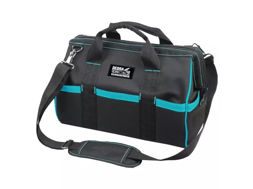 Torba za alat DED7001 ima volumen od 24 l. Torba je izrađena od robusnog, vodootpornog poliestera 600D s dvostrukim slojevima, što čini proizvod otpornim na mehanička oštećenja i štiti alat tijekom transporta. Torba se zatvara patentnim zatvaračem i ima podesiv remen za nošenje na ramenu.