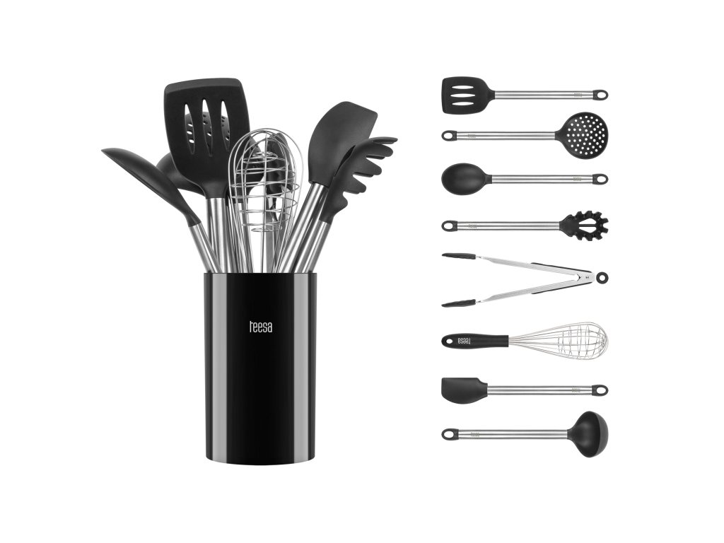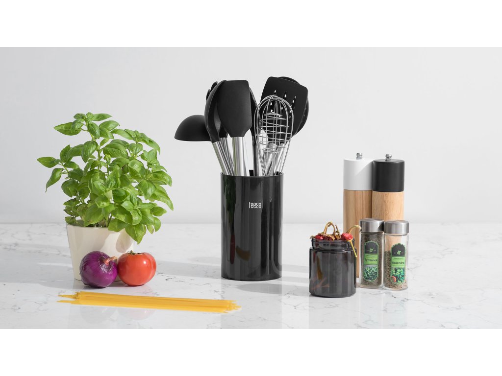 Set sadrži sav potreban pribor koji će vam pomoći u pripremi svakodnevnih jela, kao što su kutlača, žlica za posluživanje i žlica za špagete, špatula i cjedilo, metlica i kvačice. Priložena posuda u kombinaciji s elegancijom pribora potaknut će vas da alat izložite umjesto da ga uvijek držite pri ruci u ladici.