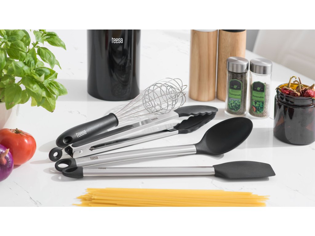 Kuhinjski pribor Teesa izrađen je od visokokvalitetnog netoksičnog i prehrambenog silikona. Vatrootporni materijal osigurava da se hrana ne lijepi na površinu posuđa, što povećava udobnost pri korištenju. Upotreba silikona ima dodatnu prednost - štiti vaše posuđe od ogrebotina. Cijelu stvar nadopunjava ručka od nehrđajućeg čelika s funkcionalnim kopčom za vješanje na kuhinjsku kuku.