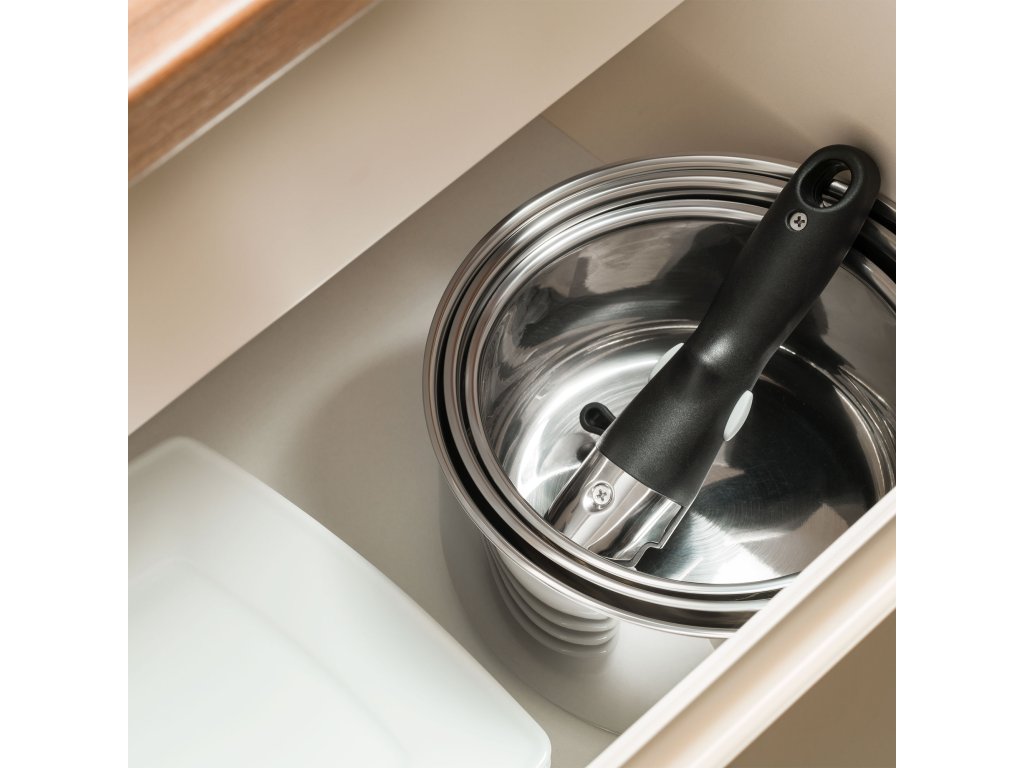 Uklonjiva ručka u kombinaciji s različitim veličinama lonaca ima još jednu prednost. Ova kombinacija omogućava stavljanje jednog lonca u drugi, tako da ih možete lako pohraniti i uštedjeti prostor u kuhinjskom ormariću.