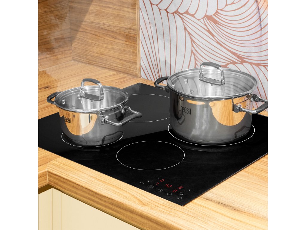 Kaljena staklena poklopca s parnim ventilom omogućuju kontrolu procesa kuhanja bez potrebe za podizanjem poklopca. Cijeli set se može lako prati u perilici posuđa – jer znamo da vrijeme nakon obroka vrijedi posvetiti opuštanju, a ne pranju posuđa.