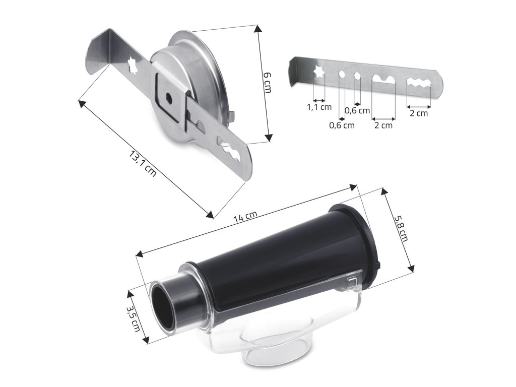 Priprema vlastitih pečenih delicija, umaka, džemova nikada nije bila tako jednostavna i brza! U setu se nalazi nastavak za izradu domaćih keksa s 5 otvora u 4 različita oblika i nastavak za prešanje voća i povrća.